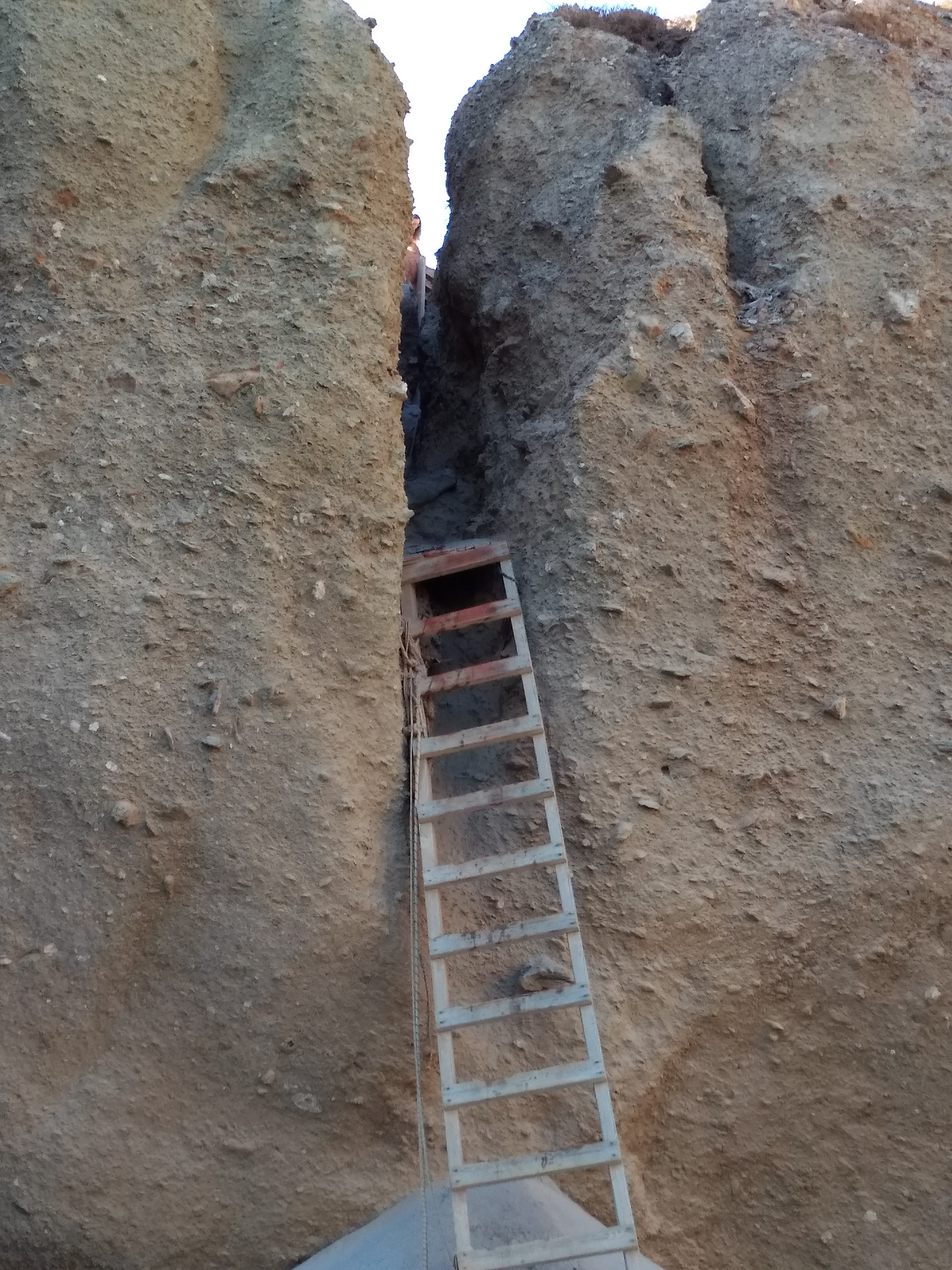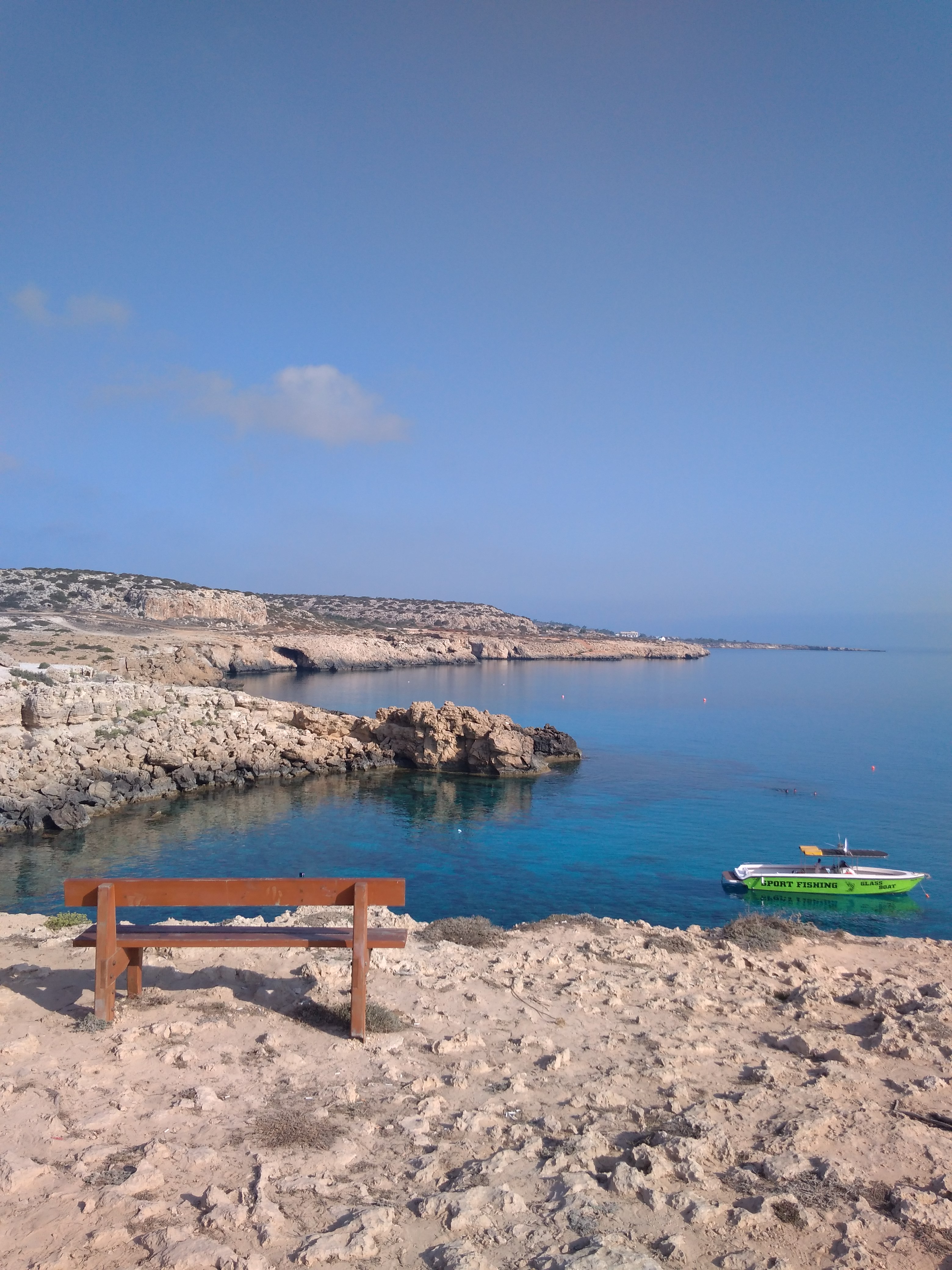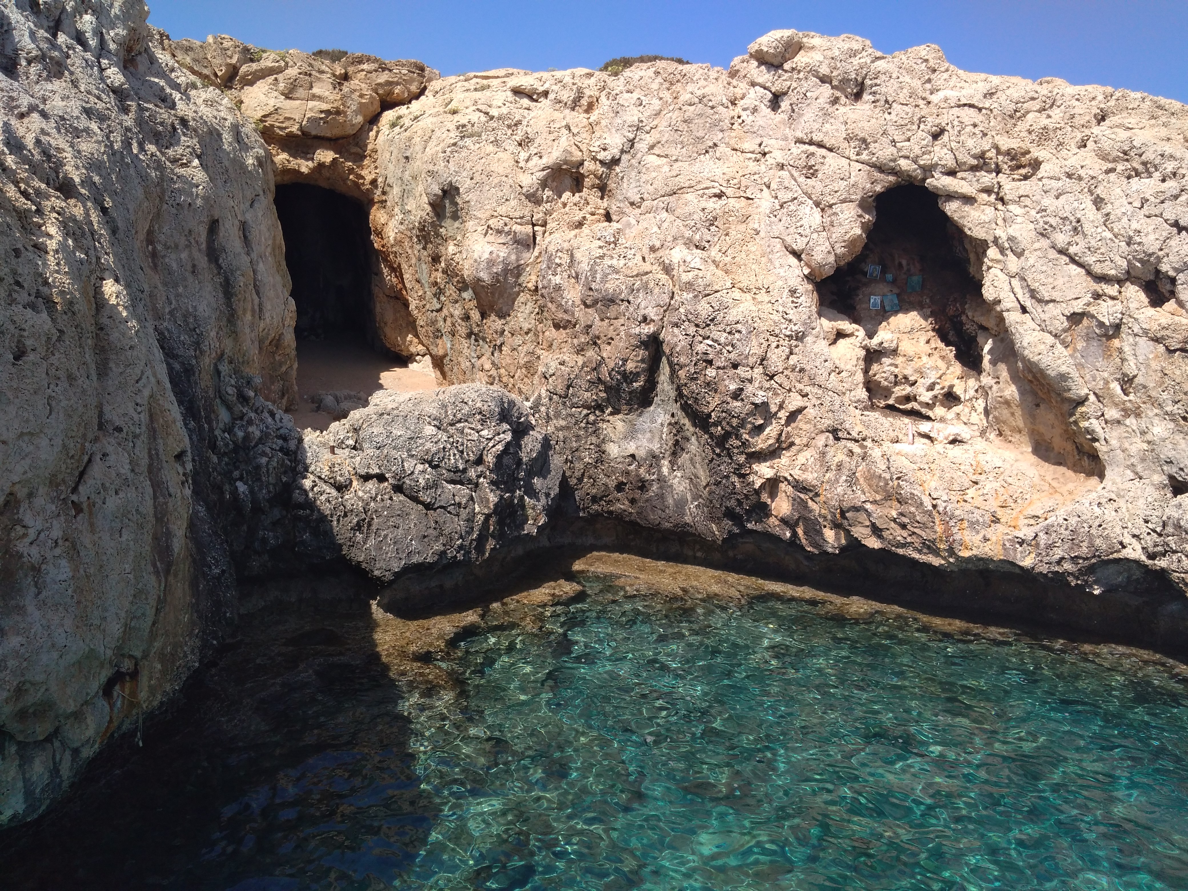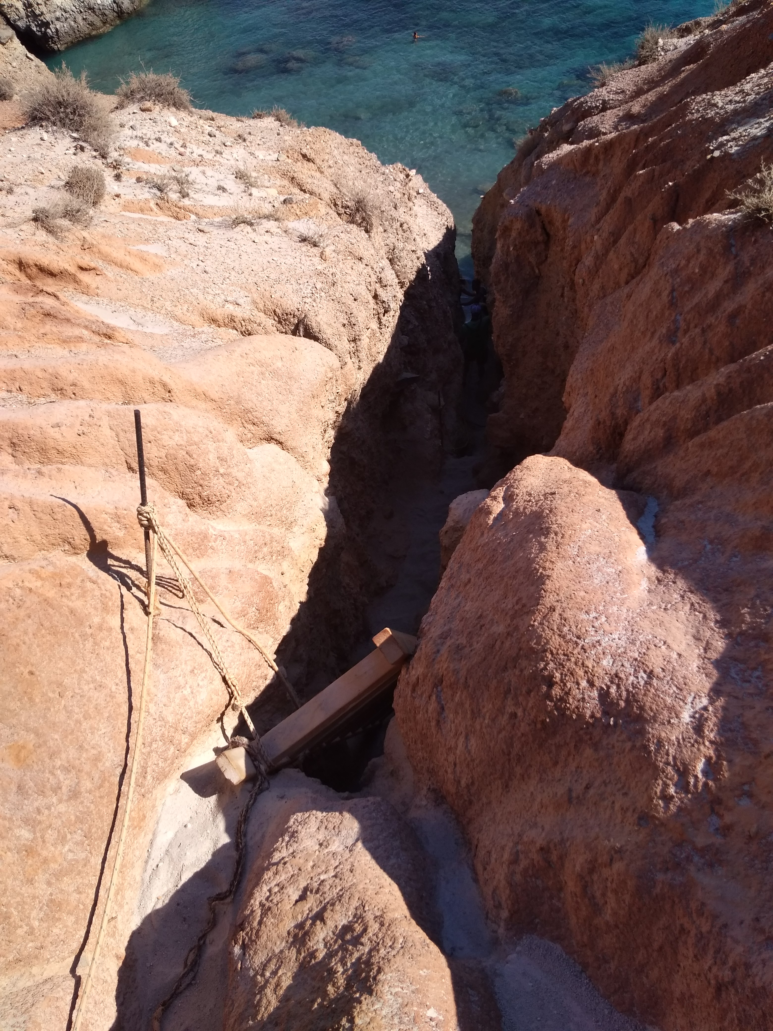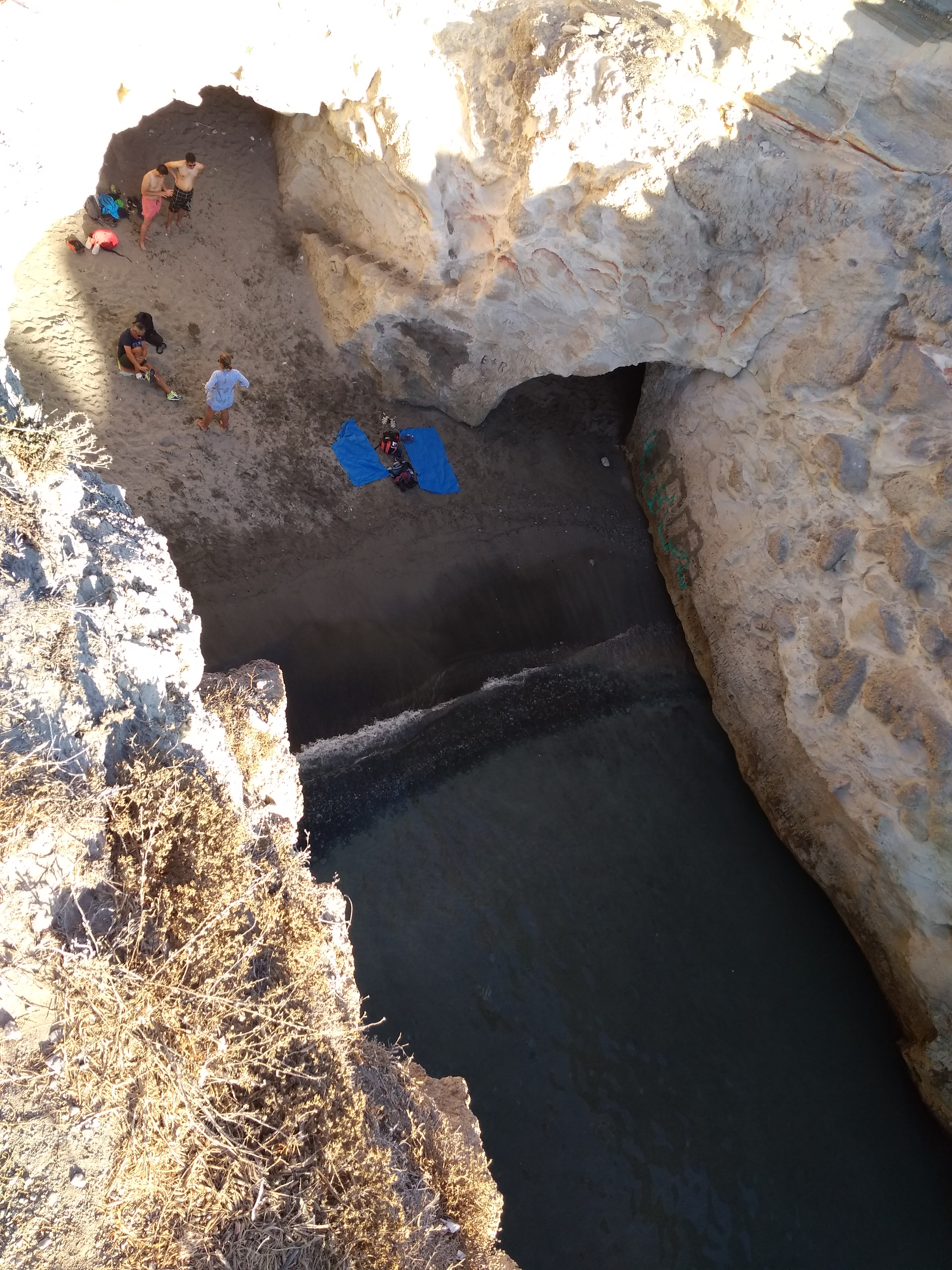 Небольшая бухта между скалами, разделенная скалой на 2 маленьких пляжа. Есть пещера прямо возле берега и есть пролив в скале. Путь к пляжу пролегает через ущелье с двумя стрёмными лестницами-стремянками