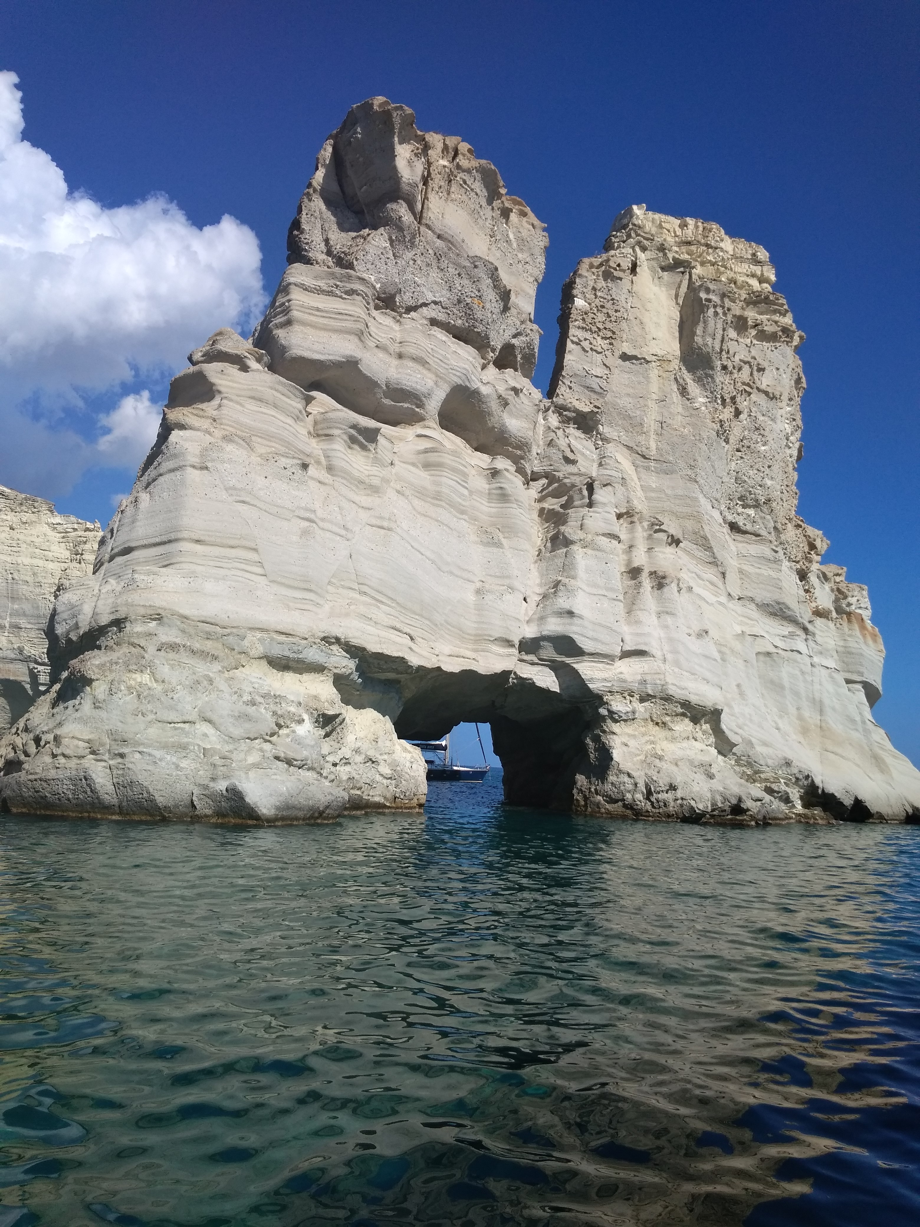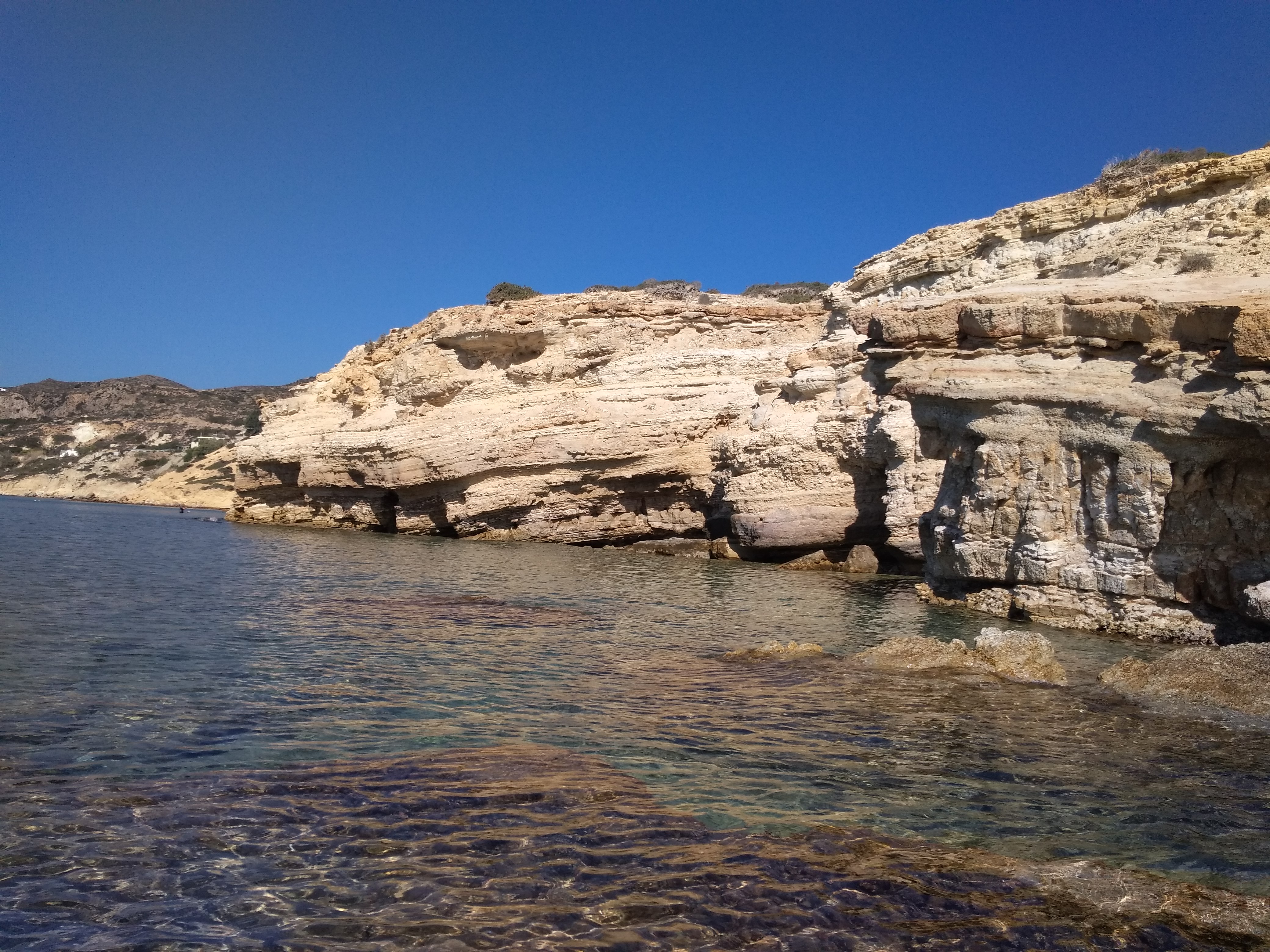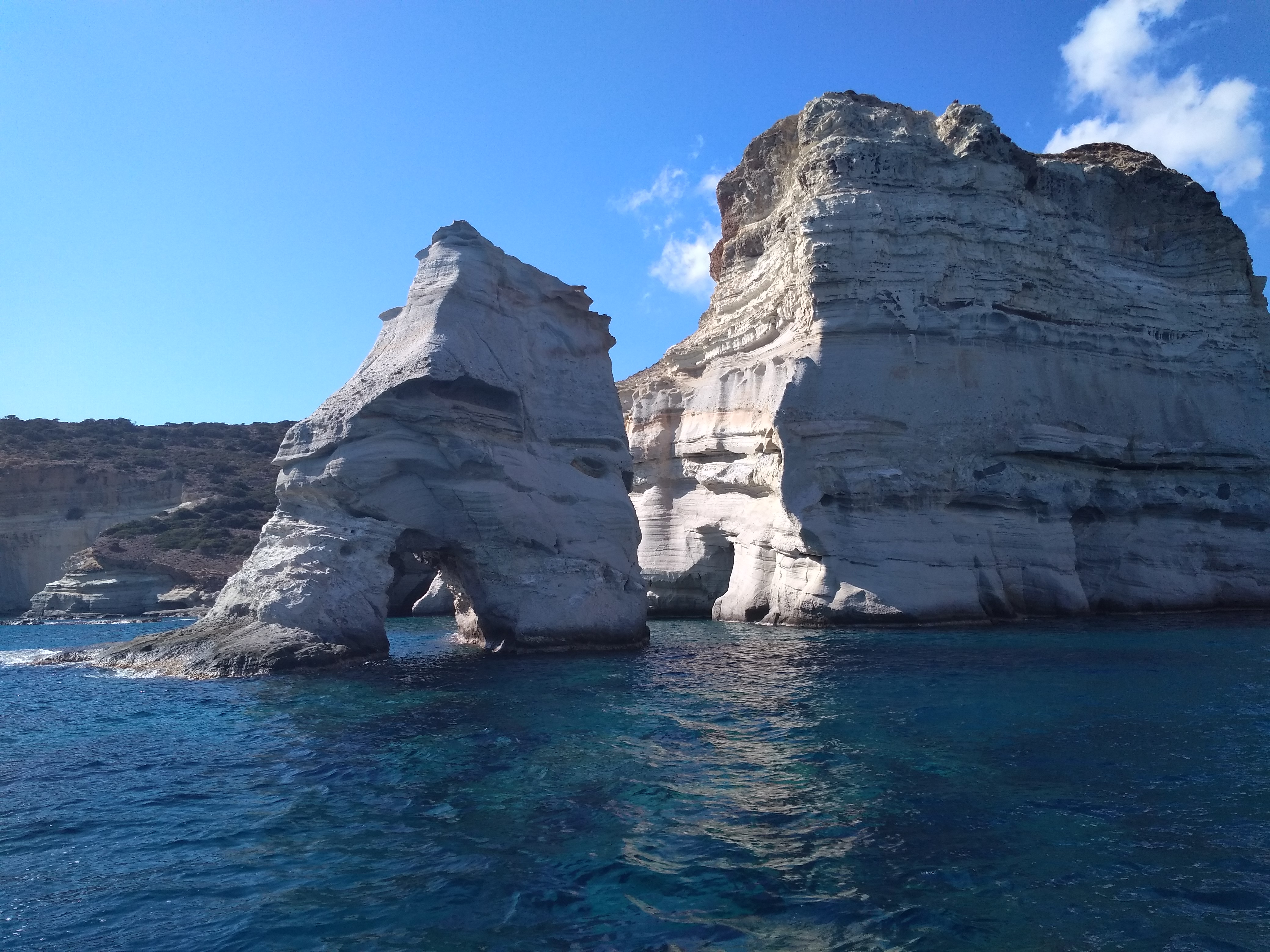 К скалистым берегам мыса Клефтико доступ есть только с воды, автомобильных дорог к нему нет. Так что мы взяли морскую экскурсию от «Delfinia boat” в одном из многочисленных экскурсионных бюро Адамаса (стоимостью 25€ для взрослых и 10€ для детей) и отправились на прогулку с пляжа Кипос. Место нереально красивое. За 3 часа прогулки у нас было 2 остановки с купанием, перекус в виде арбуза и сендвичей, а также на удивление ненавязчивое и приятное сопровождение.