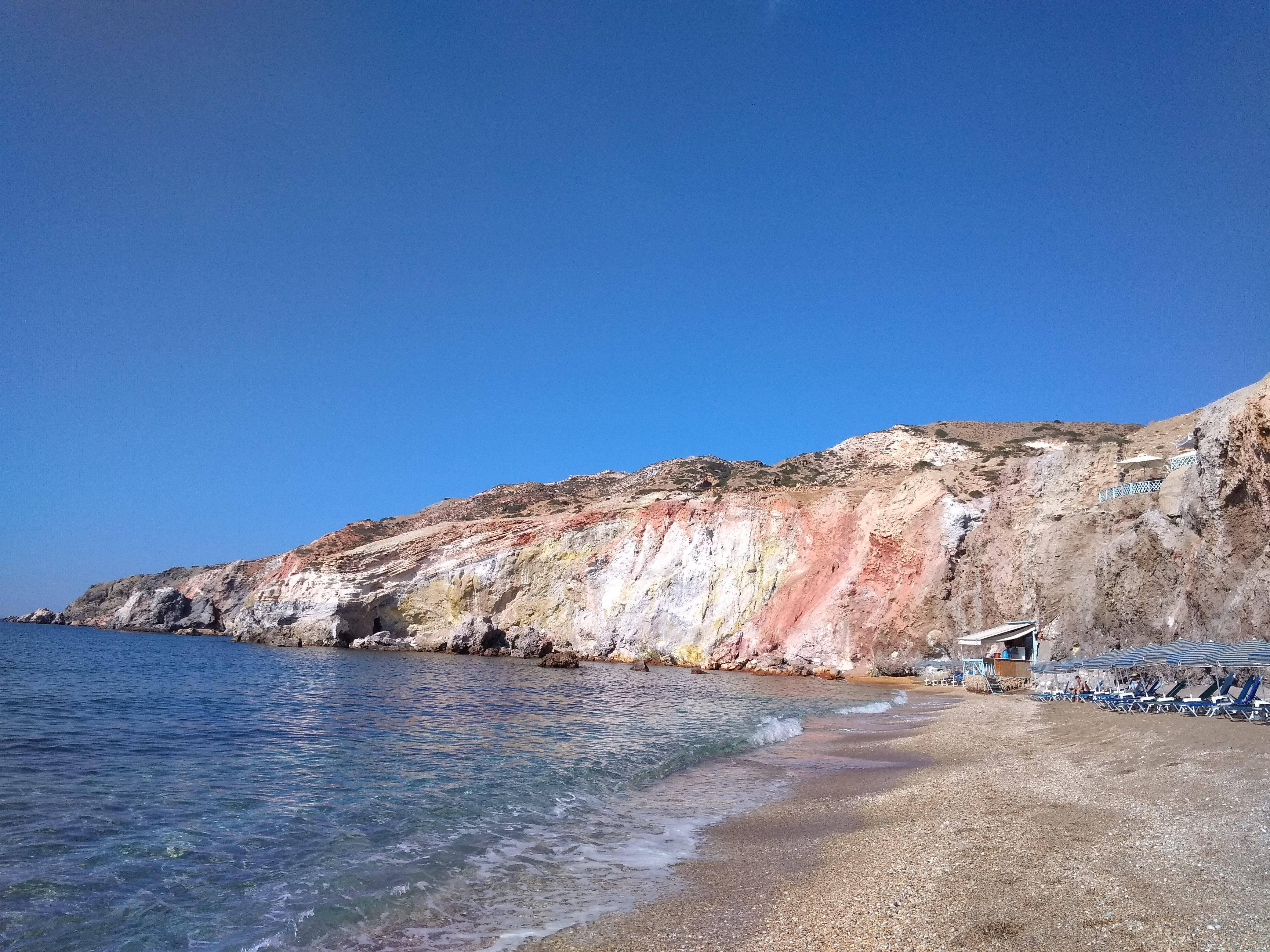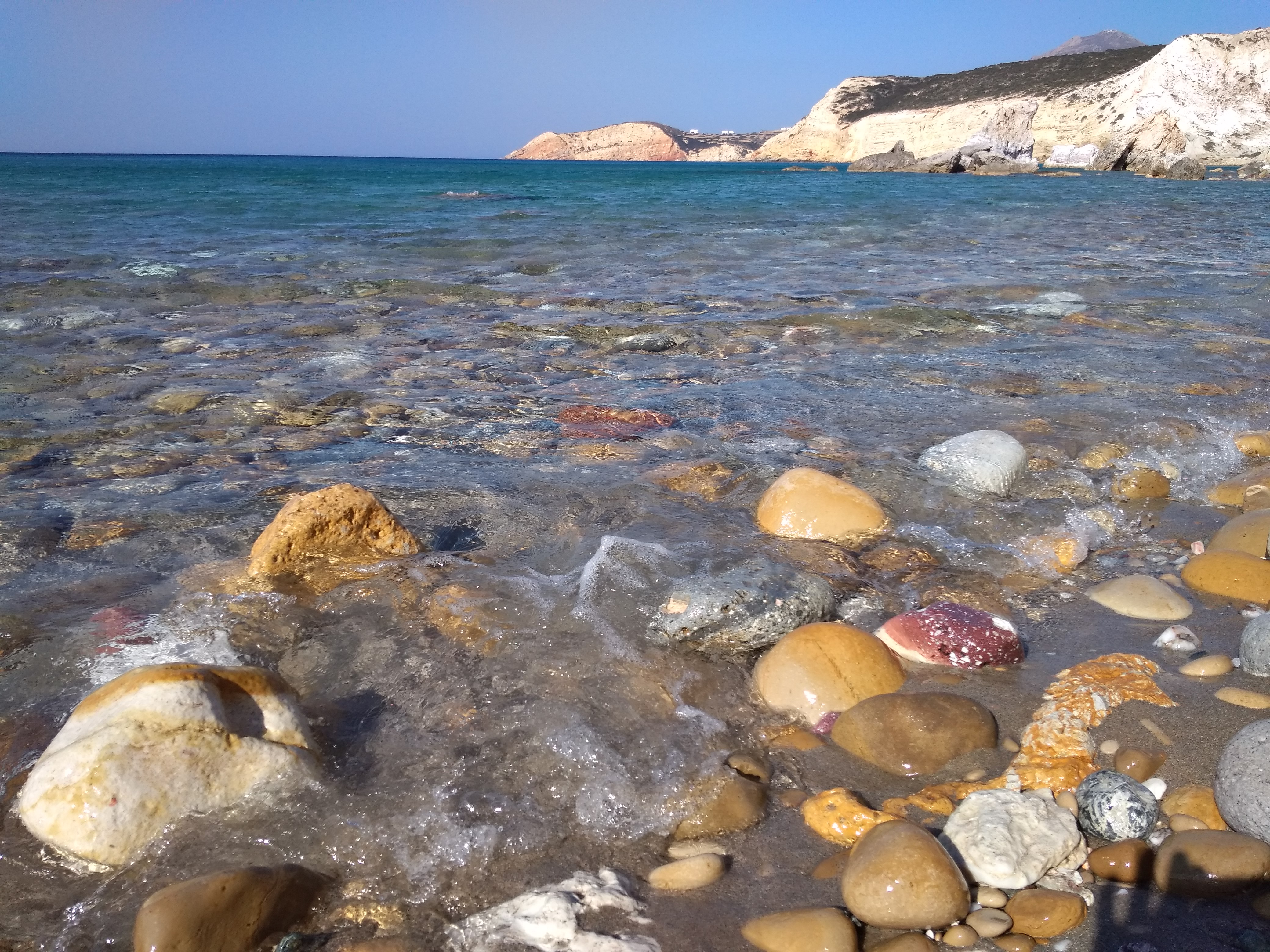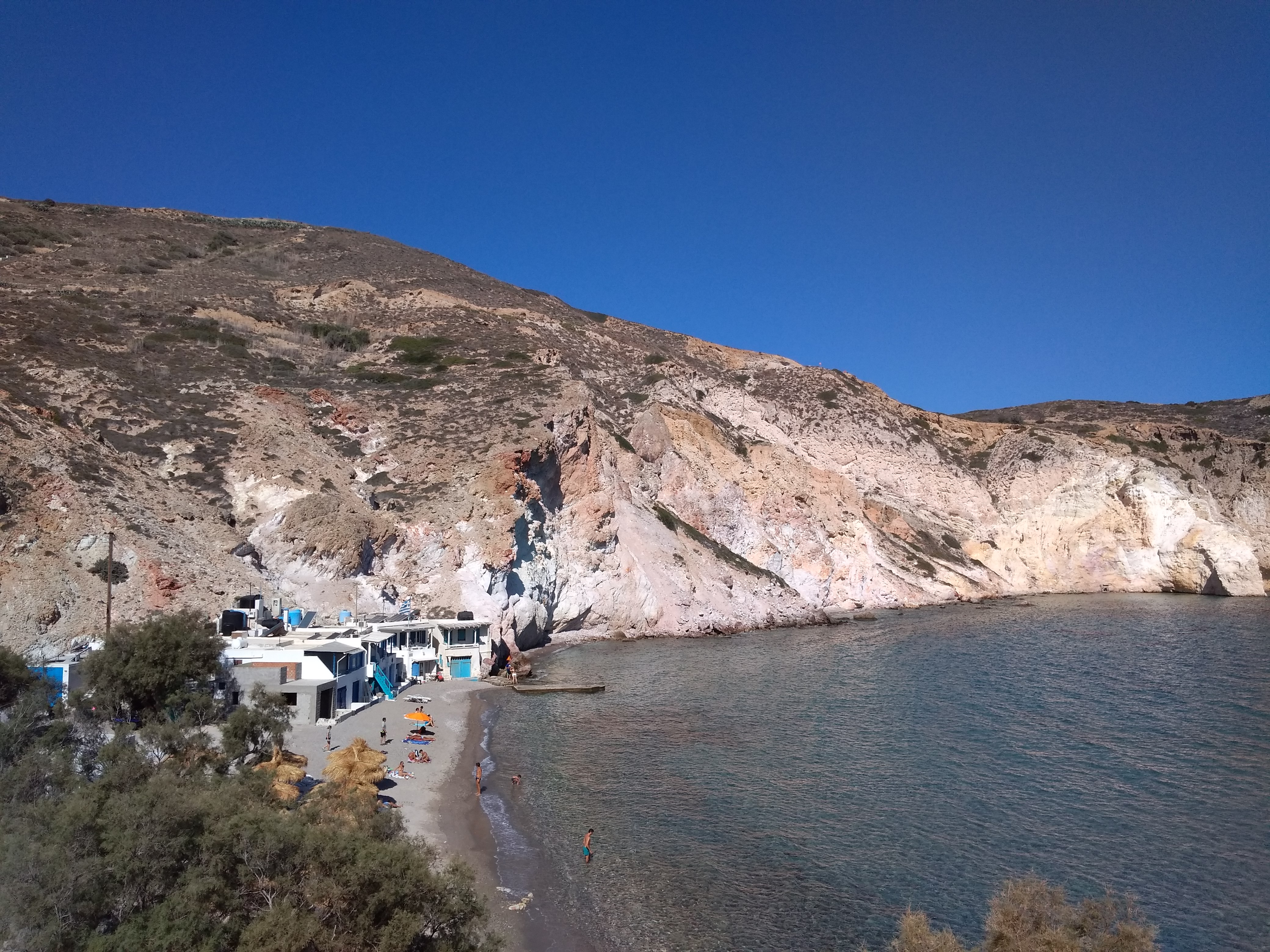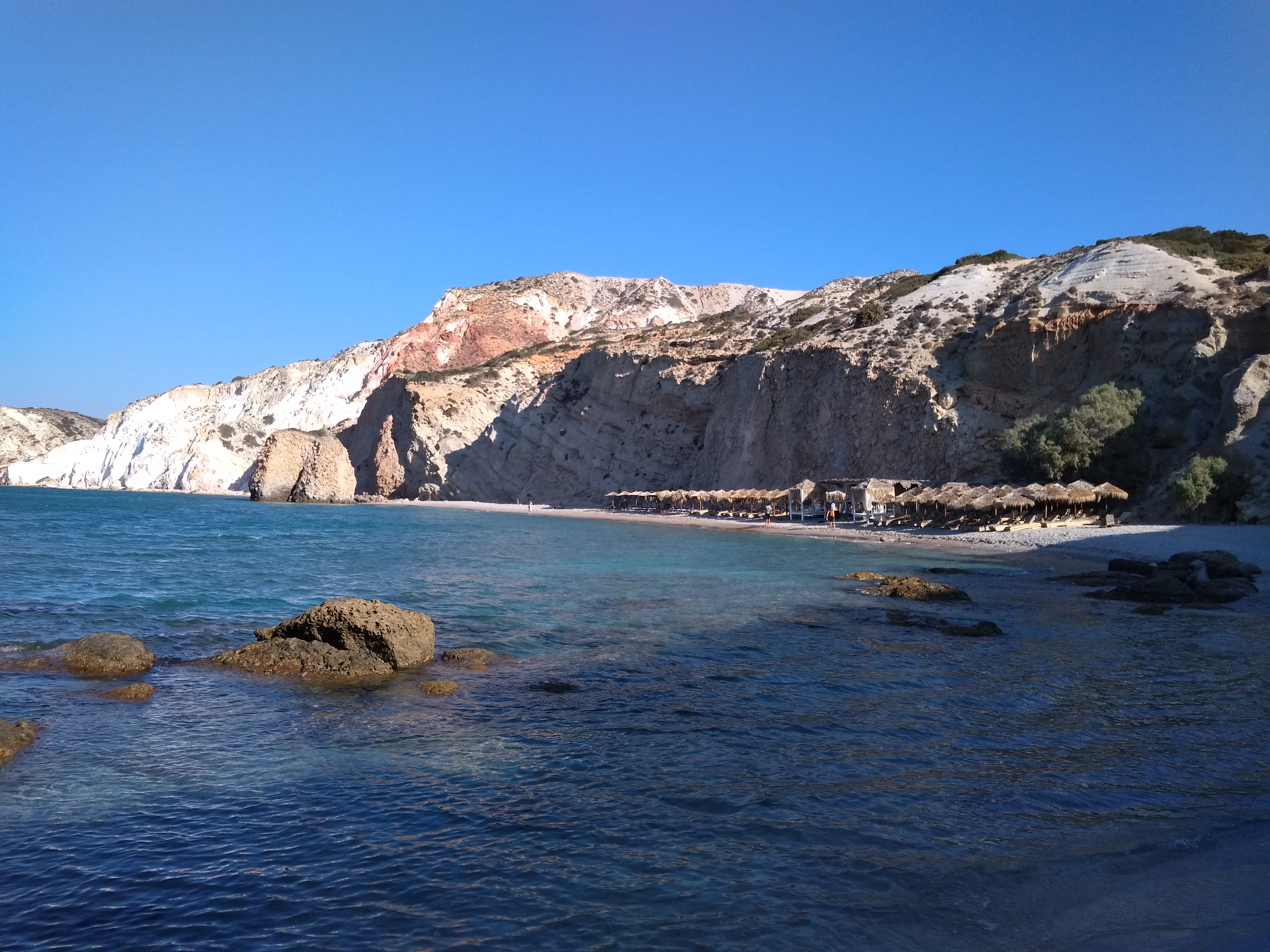Очень красивый живописный пляж с цветными скалами и горячими источниками, которые нам правда так и не удалось нащупать. Он состоит из двух бухт, западной и восточной, между которыми нет прохода. Мы в первый же день отправились на этот пляж и попали на его восточную часть, а в последний день пребывания на Милосе решили посетить еще и западный пляж. Нам здесь так понравилось, что мы даже выложили надпись на гальке «I love Milos» ))
