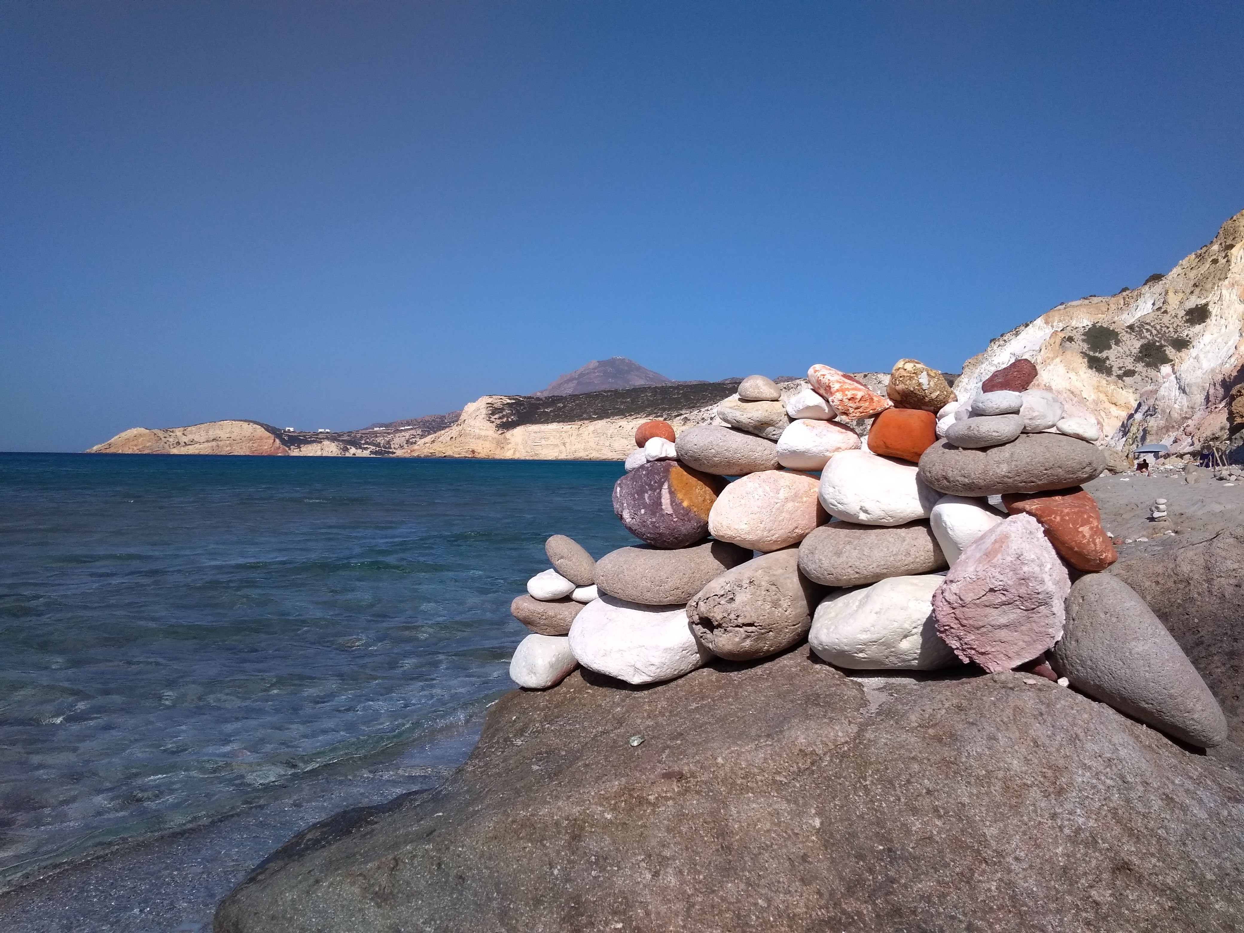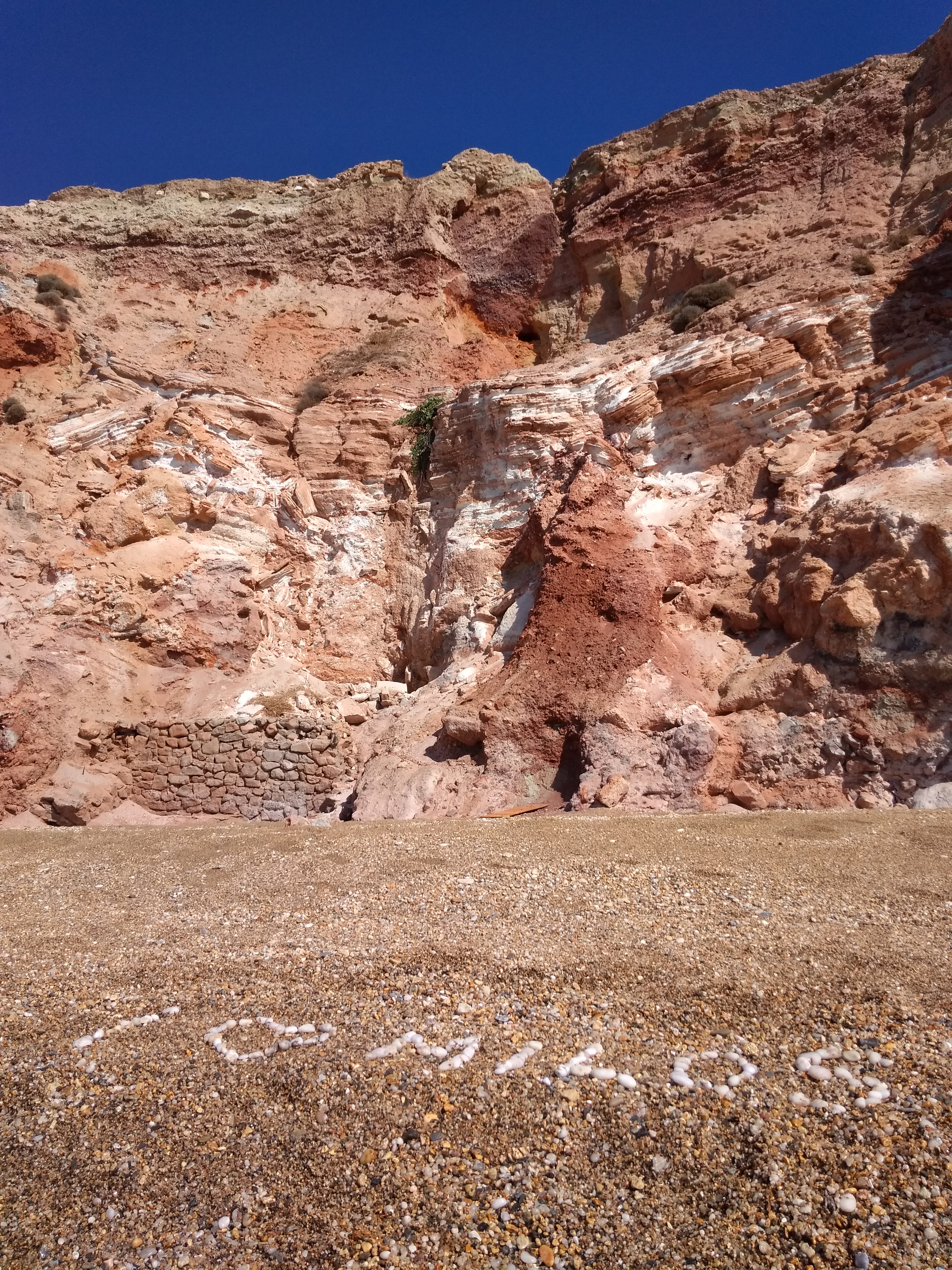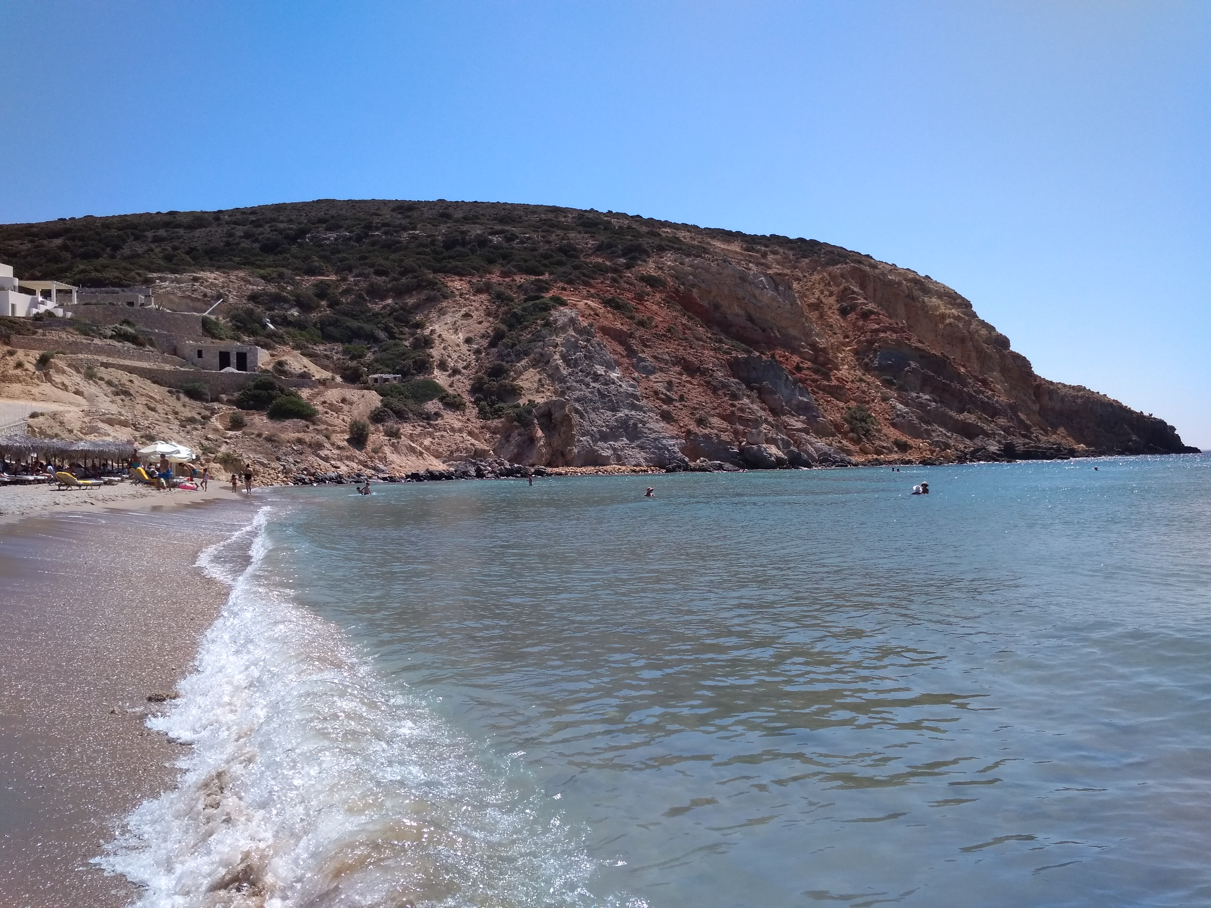 Очень красивый живописный пляж с цветными скалами и горячими источниками, которые нам правда так и не удалось нащупать. Он состоит из двух бухт, западной и восточной, между которыми нет прохода. Мы в первый же день отправились на этот пляж и попали на его восточную часть, а в последний день пребывания на Милосе решили посетить еще и западный пляж. Нам здесь так понравилось, что мы даже выложили надпись на гальке «I love Milos» ))