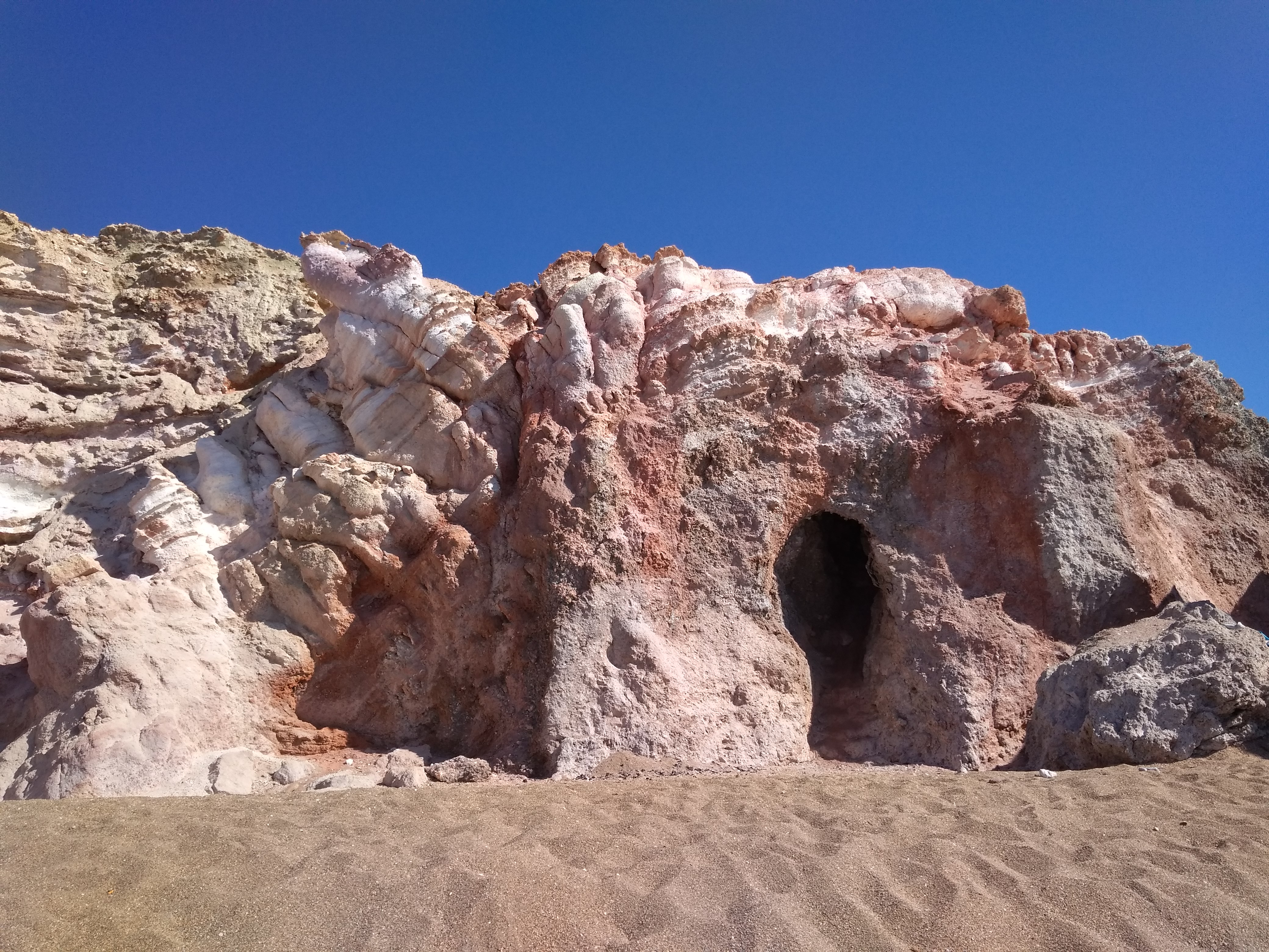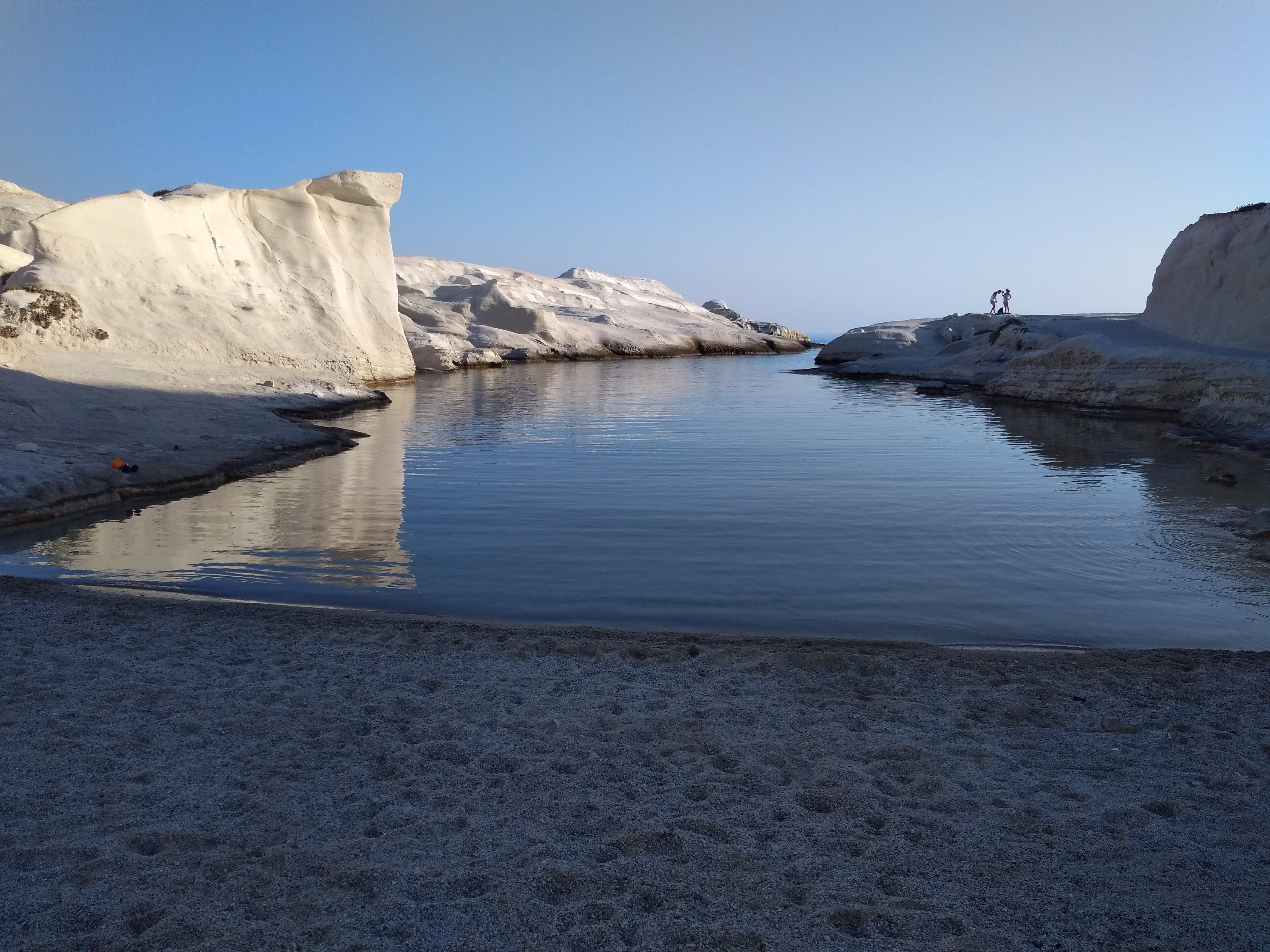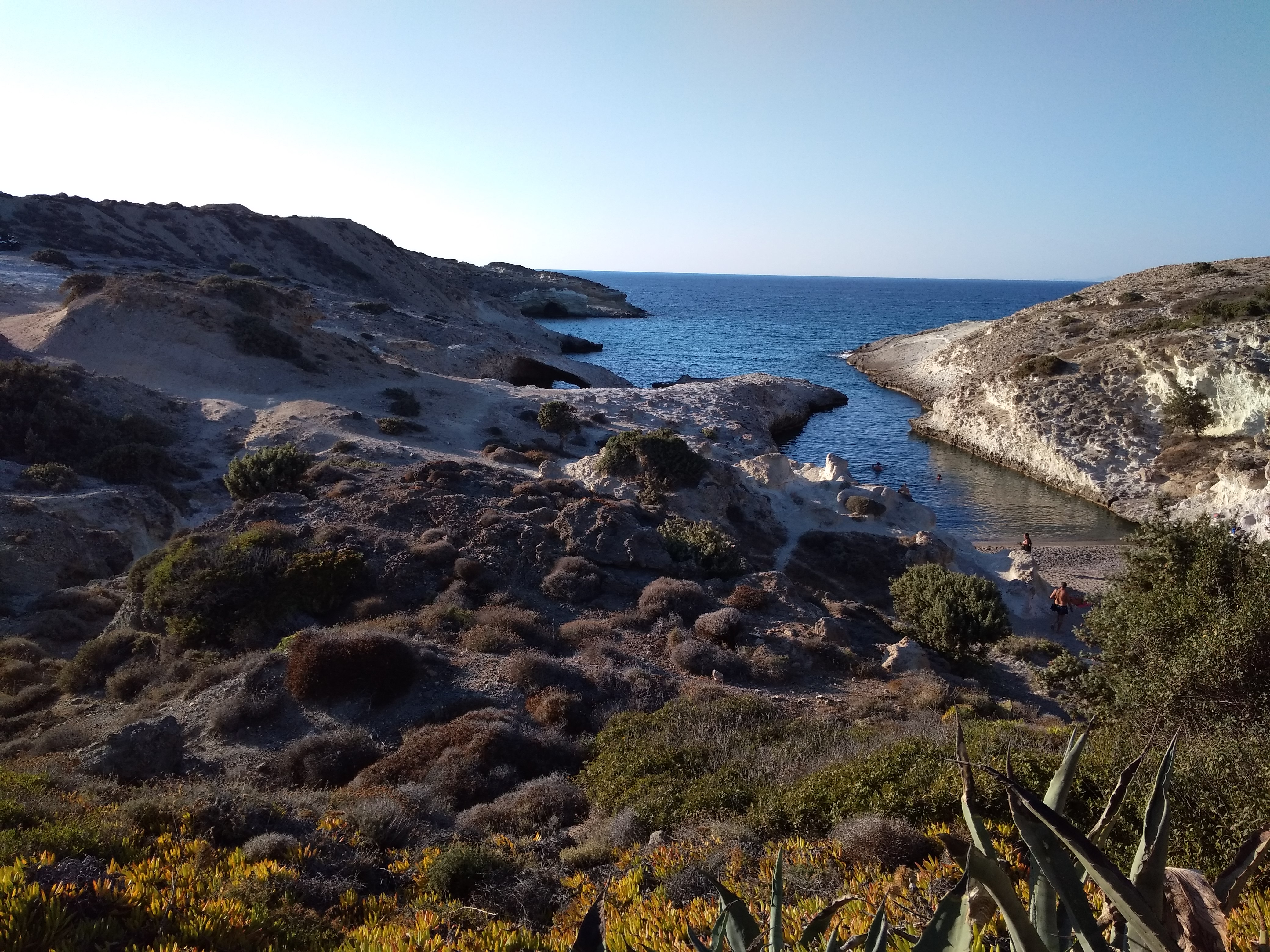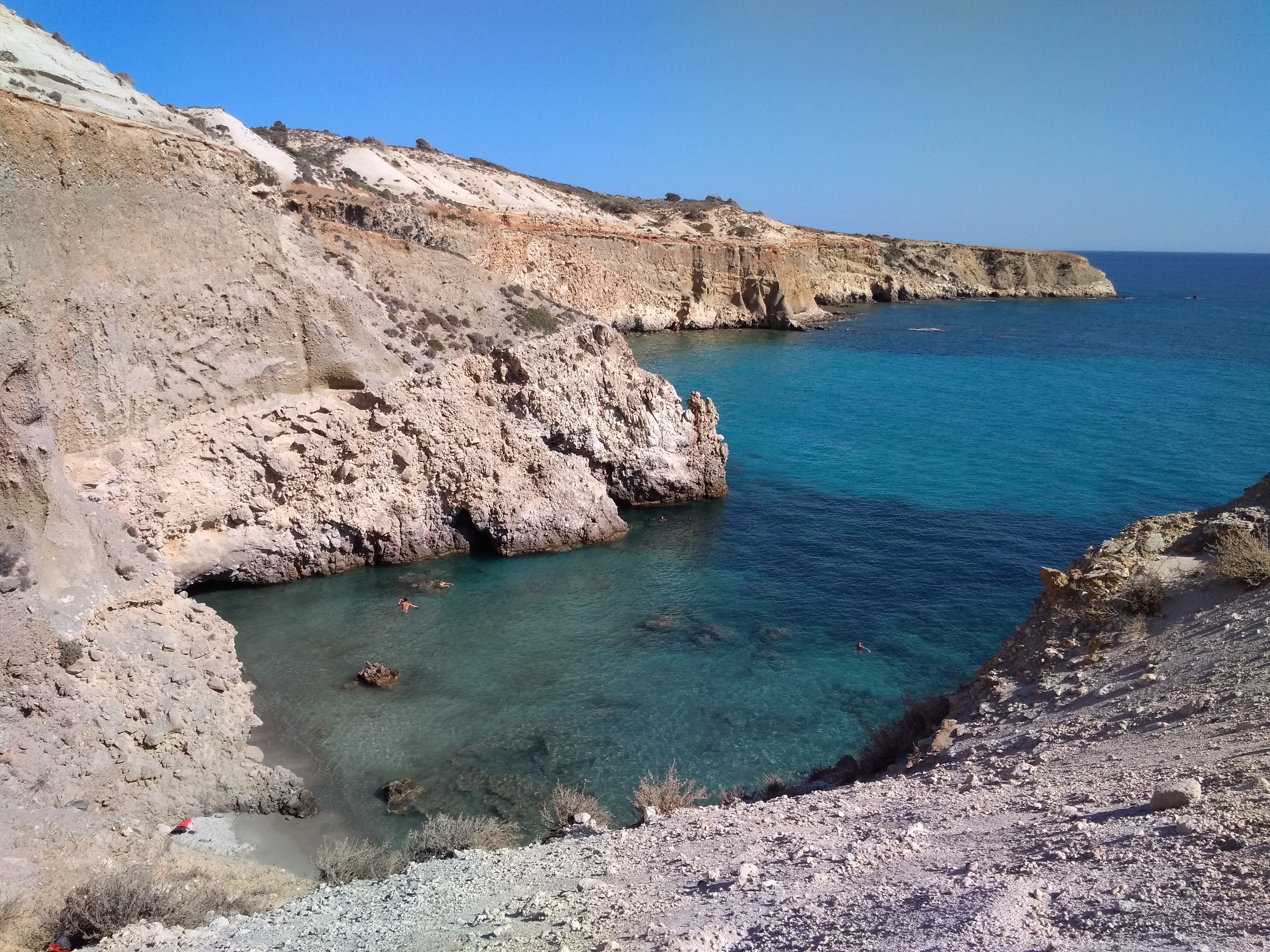 Очень красивый живописный пляж с цветными скалами и горячими источниками, которые нам правда так и не удалось нащупать. Он состоит из двух бухт, западной и восточной, между которыми нет прохода. Мы в первый же день отправились на этот пляж и попали на его восточную часть, а в последний день пребывания на Милосе решили посетить еще и западный пляж. Нам здесь так понравилось, что мы даже выложили надпись на гальке «I love Milos» ))