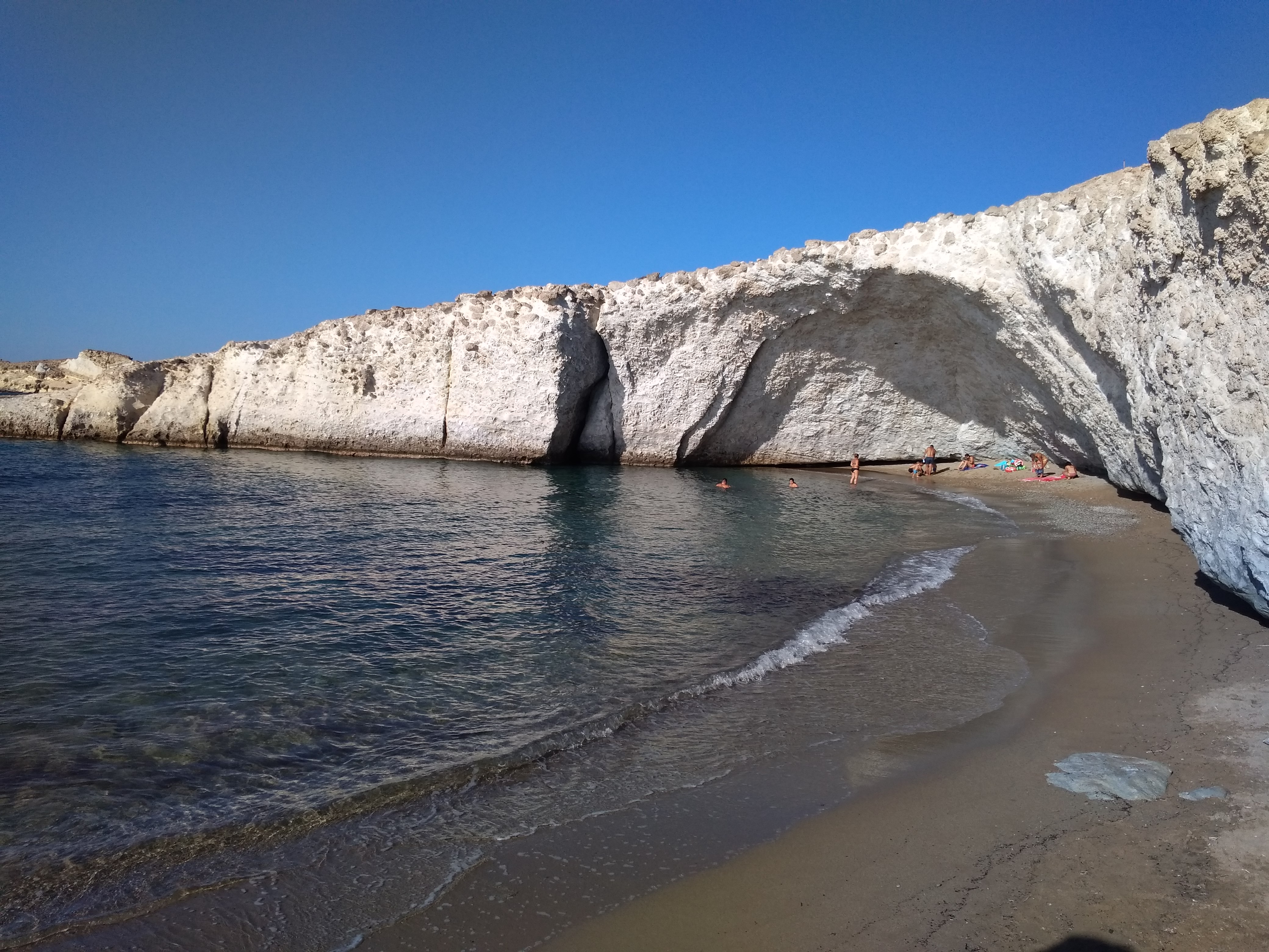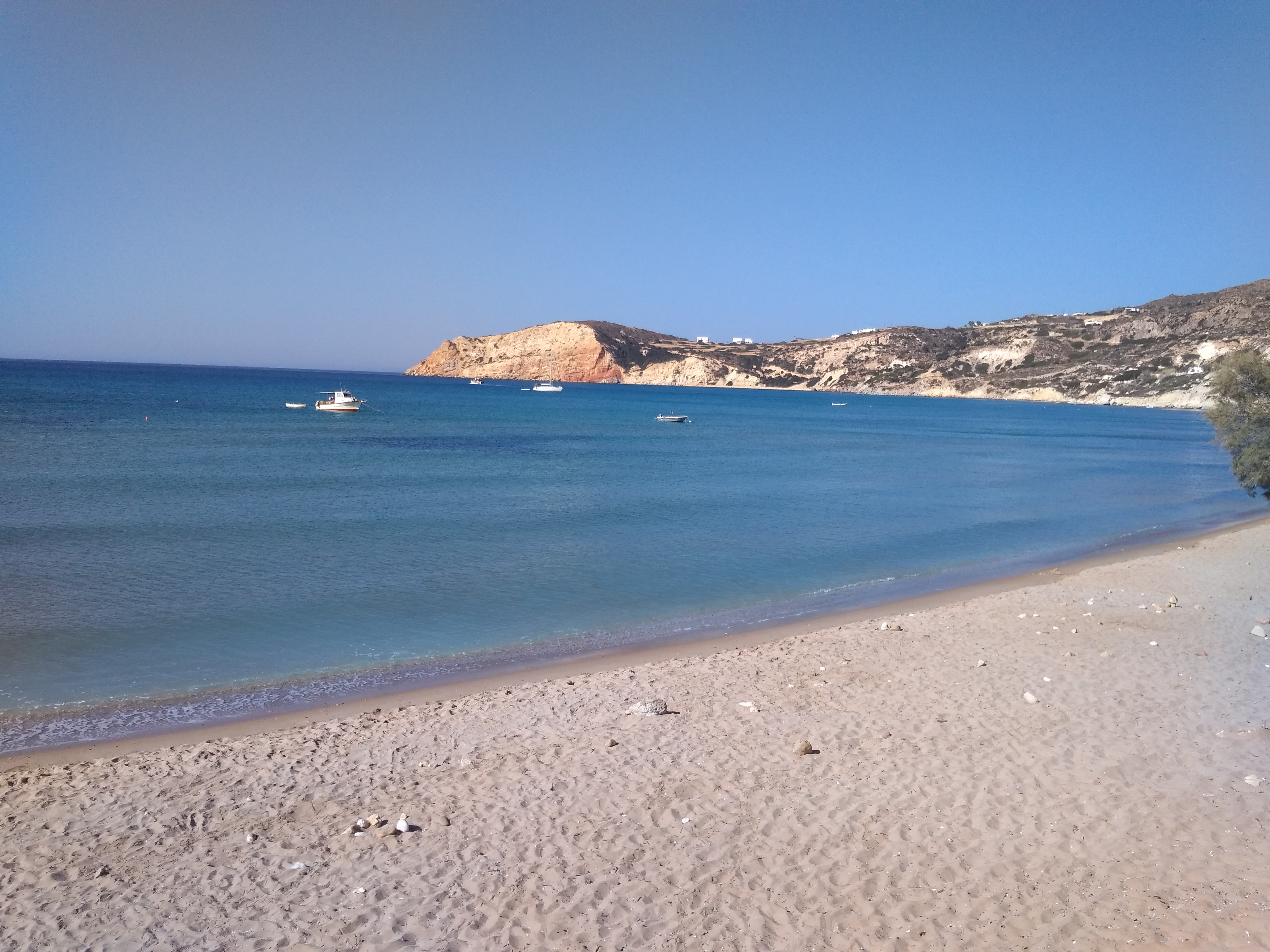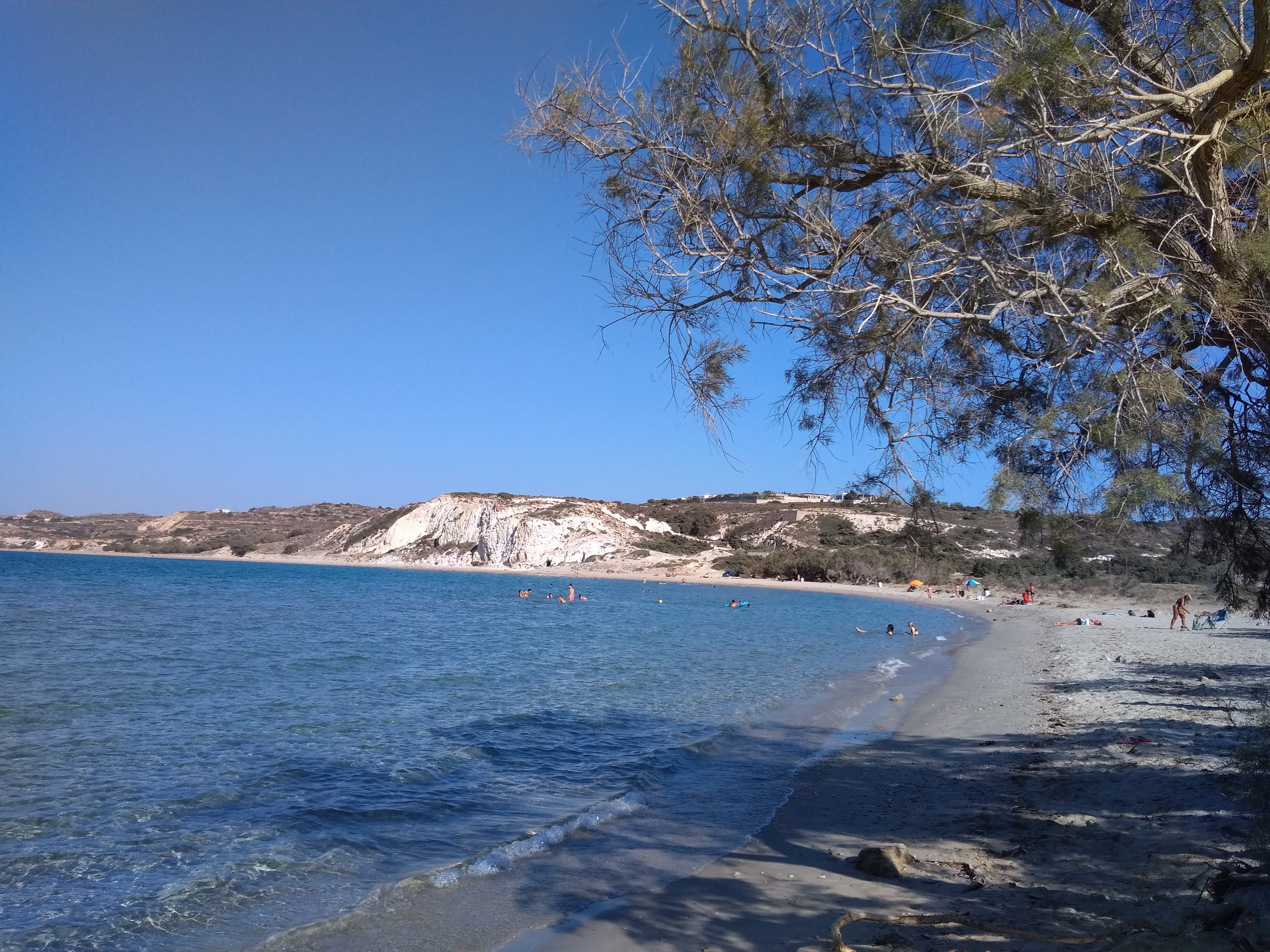 Мелкий пляж во внутреннем заливе Милоса, тянется вдоль дороги и находится сразу за Адамасом в сторону аэропорта, вход не удобный, под ногами песок, водоросли, камни, но есть тенек в виде деревьев. Единственное его достоинство — можно дойти пешком от Адамаса.