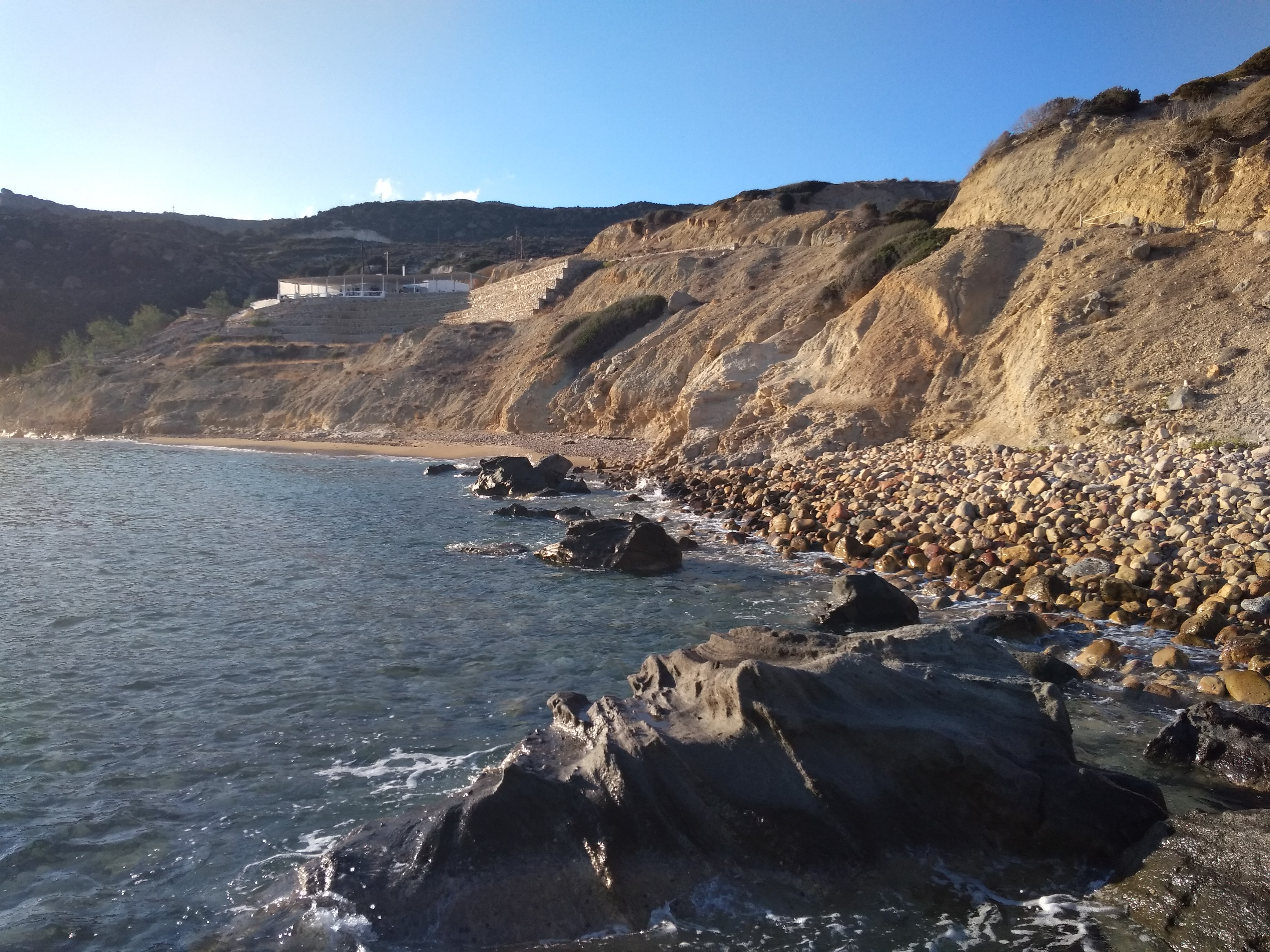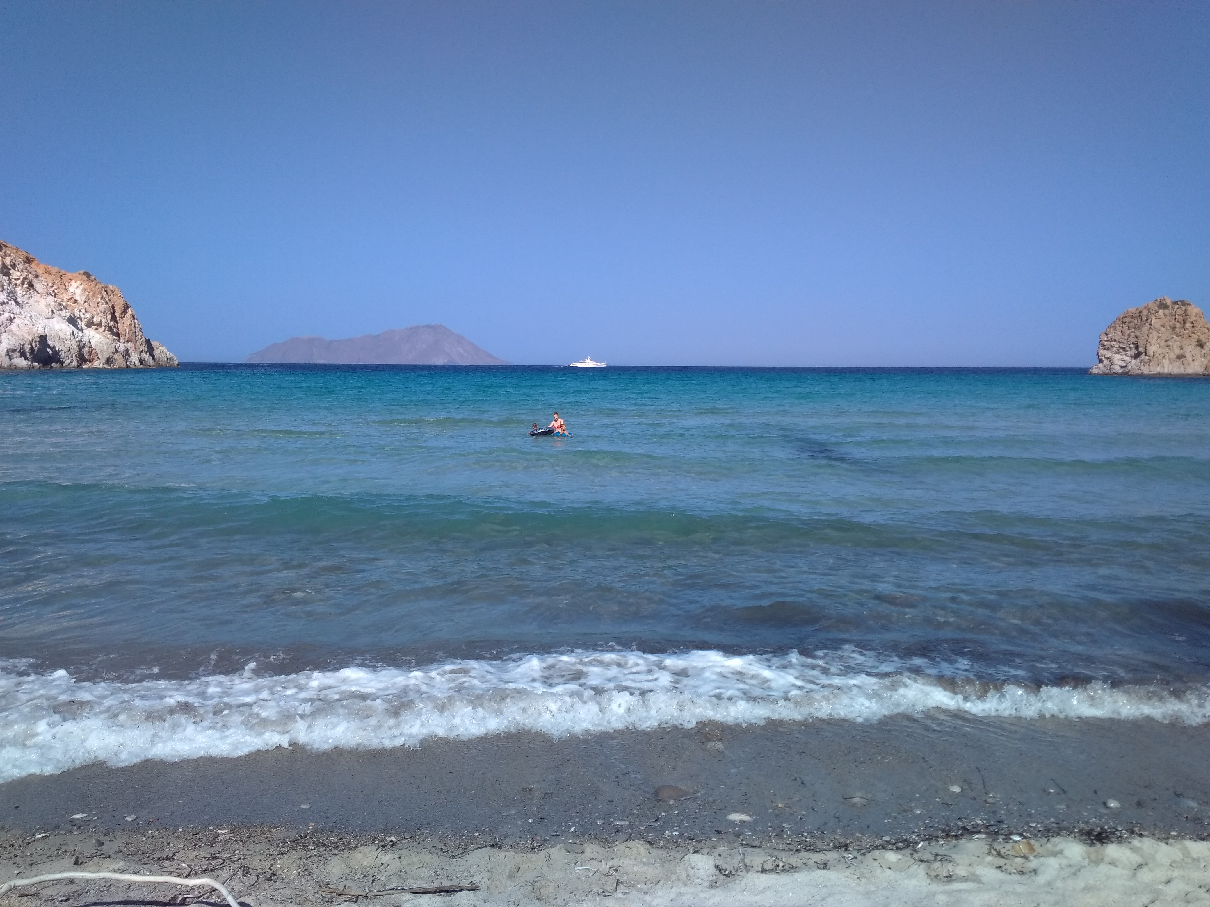 Каменистый пляж с баром и причалом, откуда отправляются прогулочные катера к Клефтико. Отдыхающих на пляже мы не видели, так как заход в воду очень неудобный.