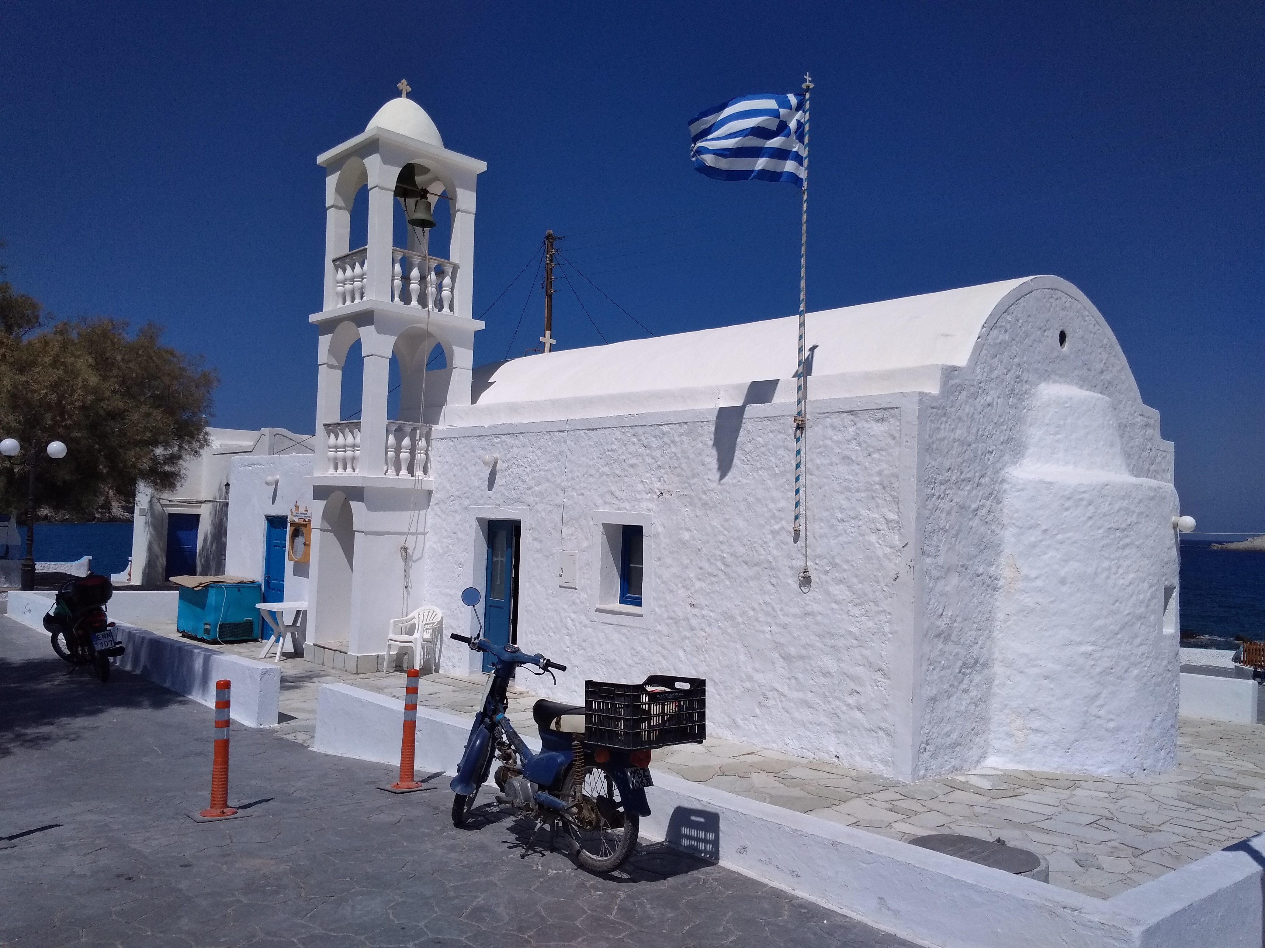 Увидев пустынные скалистые пейзажи острова и непроглядно запыленную машину встречающей нас хозяйки отеля, как то взяли нас сомнения, правильный ли выбор места для отдыха мы сделали. А вдруг тут ветренно, пыльно и нечем дышать… Даже дети испуганно поинтересовались: «Мама, ты зачем нас в пустыню привезла?» ))) Но по дороге к нашему отелю в Адамасе слева показалось прозрачное море, впереди белел поднимающийся ввысь портовый городок и все наши сомнения быстро развеялись. Дороги хорошие, погода теплая и безветренная. А машина пыльная оказалась потому, что её хозяйка накануне решила поисследовать труднодоступные пляжи, добраться до которых можно только грунтовыми дорогами.