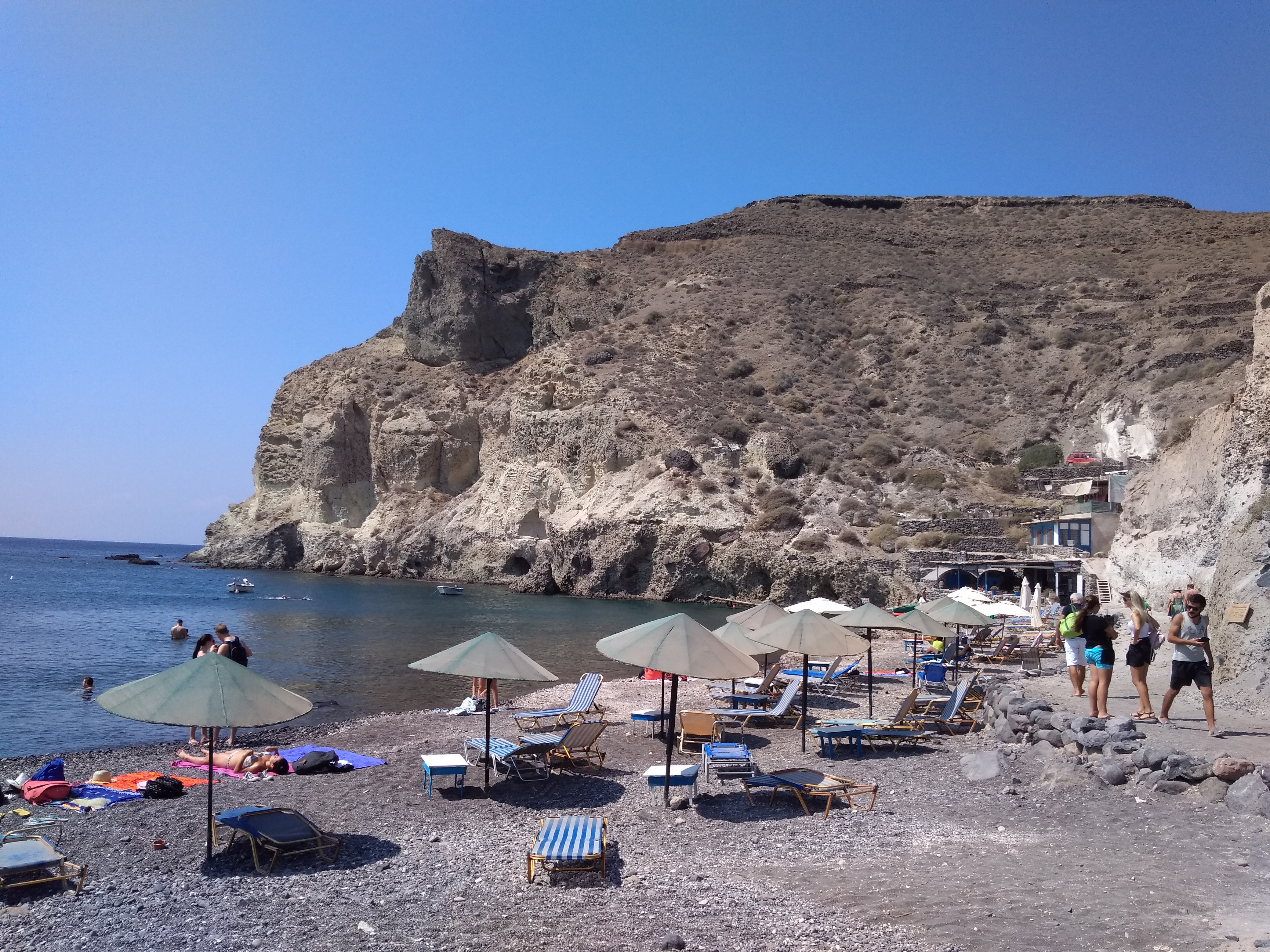 Вулканический галечный пляж длиной в 5-7 км, вдоль которого тянутся кафе-рестораны. За лежаки плату не берут, можно просто заказать обед или напитки в ближайшей таверне. Места на пляже достаточно. Заход в воду довольно резкий для детей.