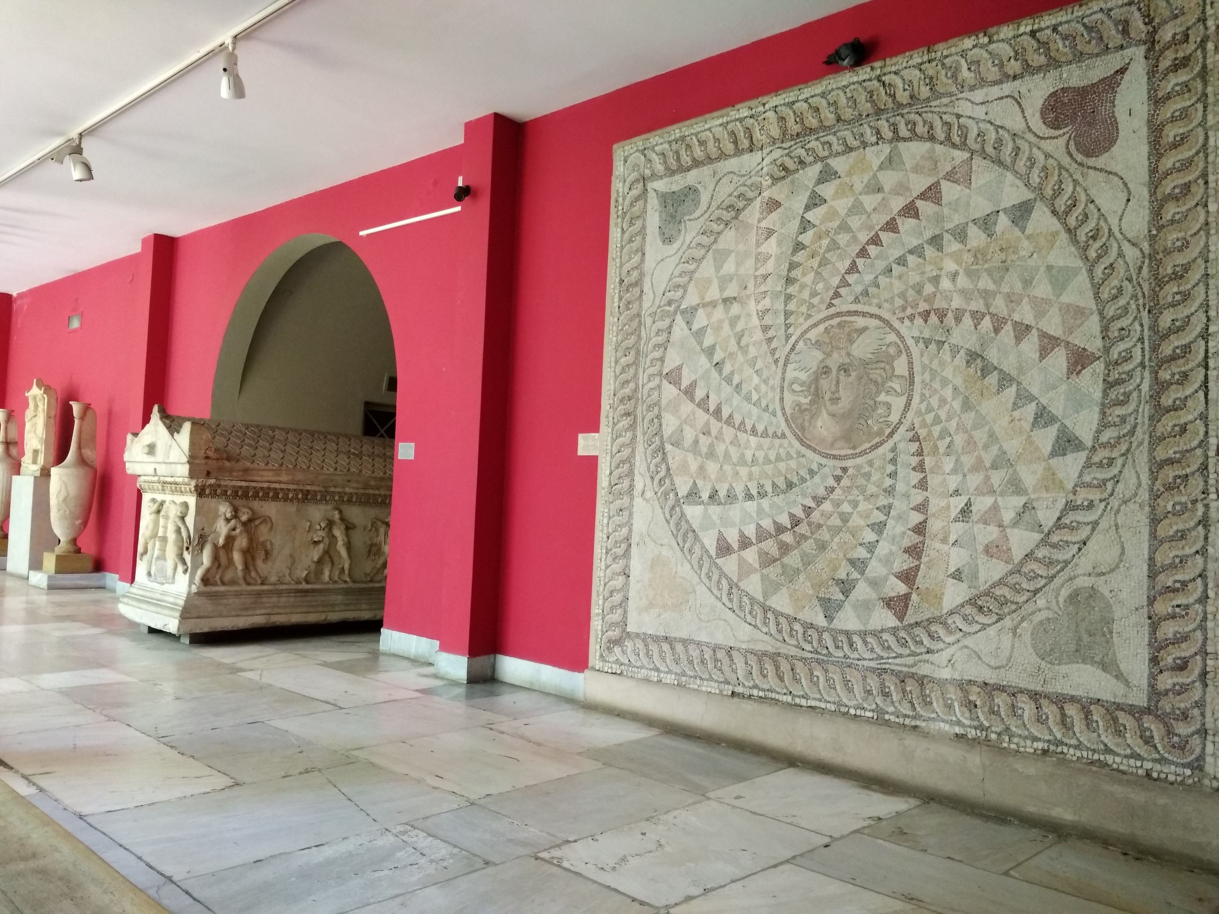 На нижнем этаже музея есть очень хорошее так называемое археологическое кафе, где можно посидеть прямо в саду со статуями и фресками вдоль стен: