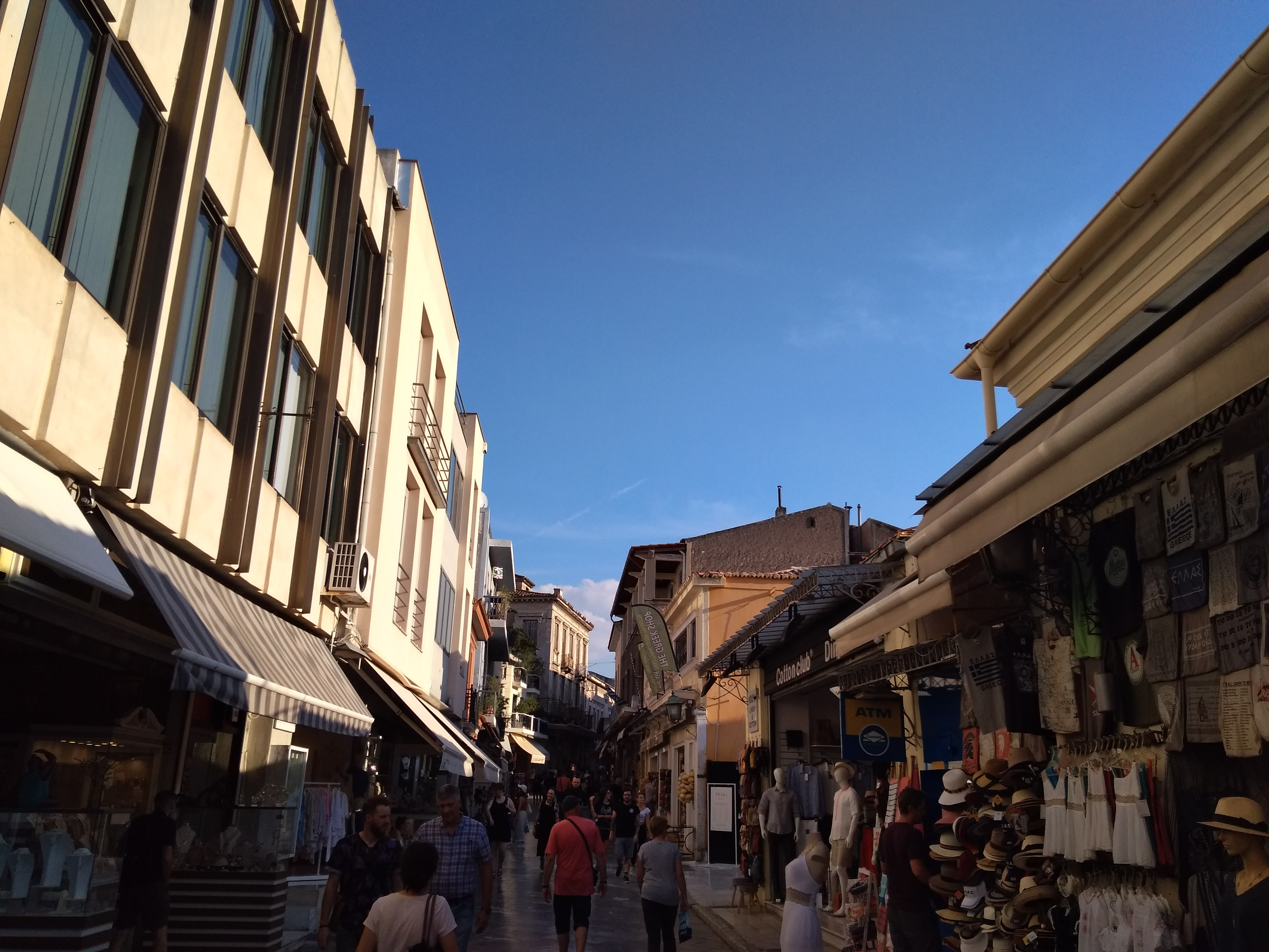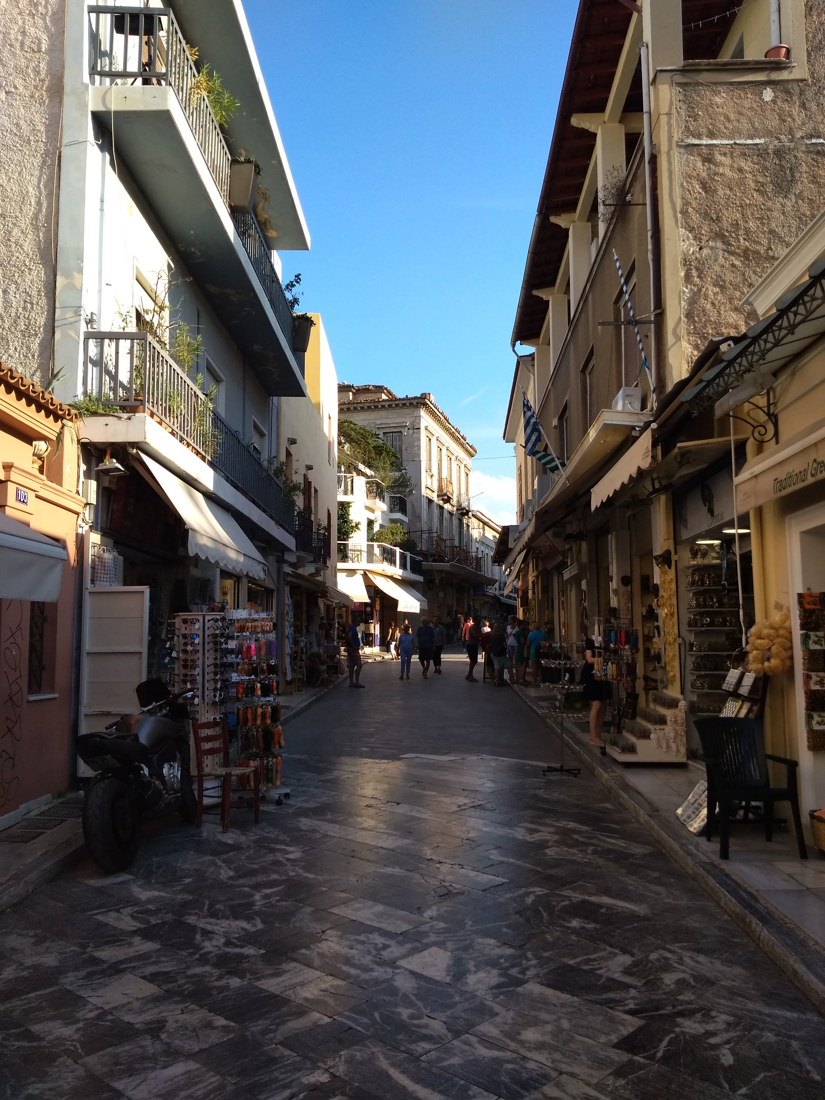 До Плаки мы дошли часов в 6 вечера. Здесь на узких улочках расположились магазинчики с одеждой и сувенирами, а также множество рестораников и кафе: