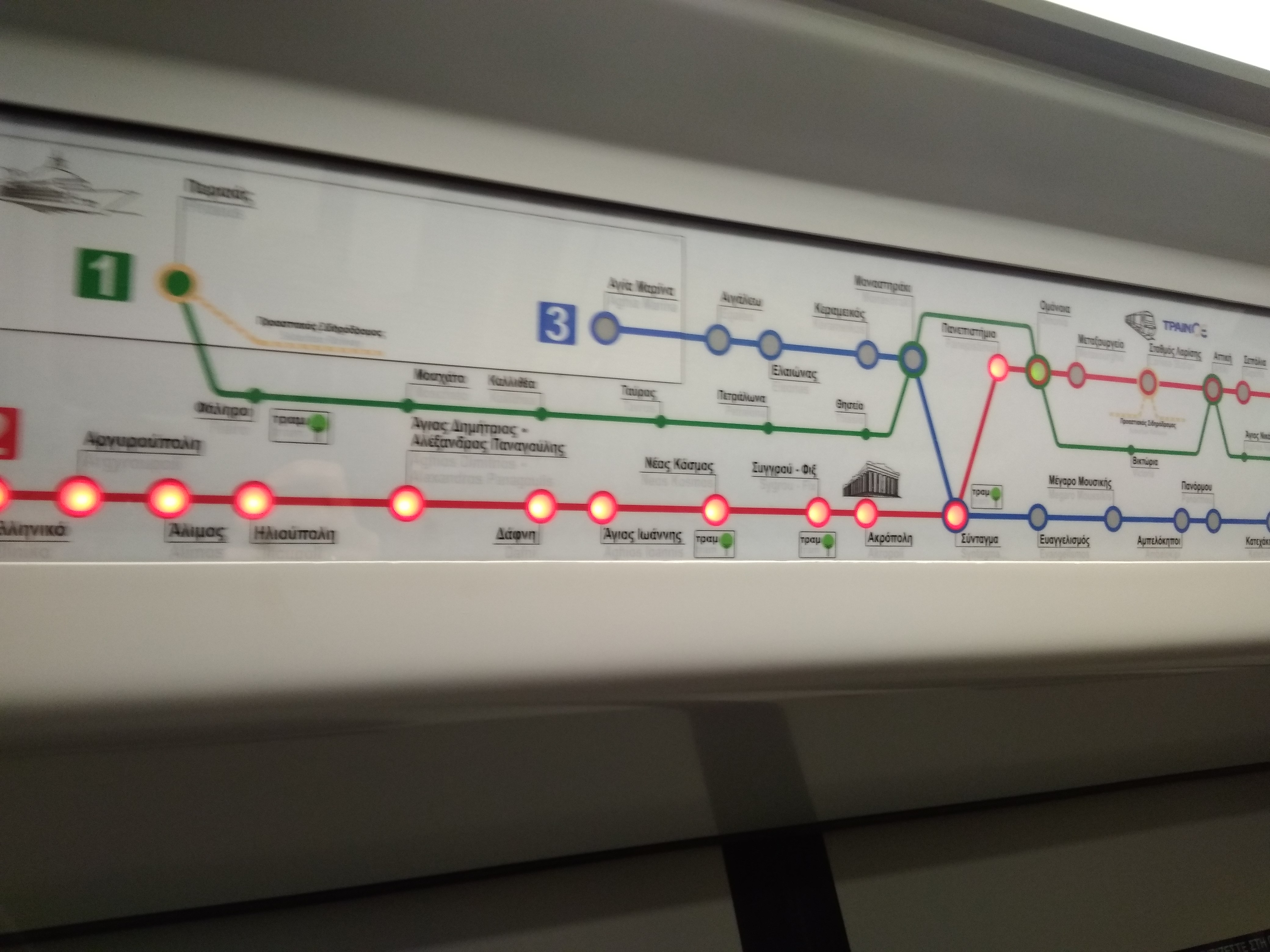 После встречи заката на холме Акрополя мы поспешили за нашими вещами в отель и оттуда уже направились в аэропорт. В этот раз ехали на метро. Кстати, метро в Афинах чистое и очень продуманное. Всего 3 ветки, в вагонах на табло наглядно подсвечиваются оставшиеся на пути станции. Добраться можно не только по городу, но и в порт и в аэропорт. Дорога обошлась нам в 10€ со взрослого, детям было бесплатно.